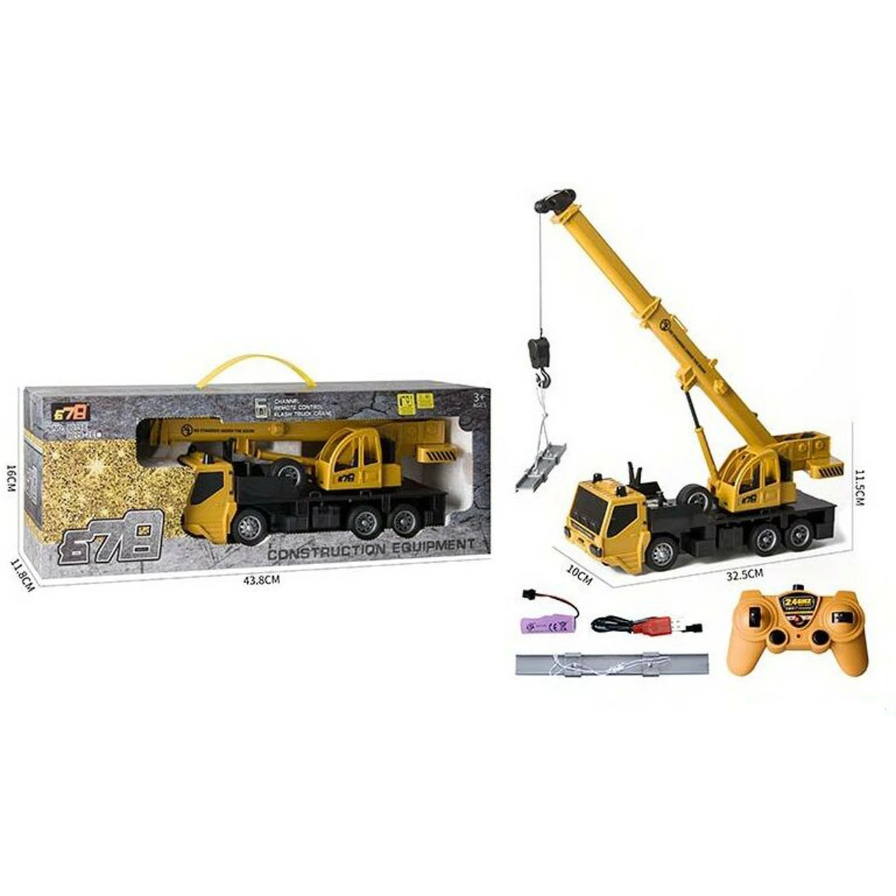 USB-кабель. Автокран работает от аккумуляторной батареи - входит в комплект. Пульт работает от 2-х батареек АА - не входят в комплект.