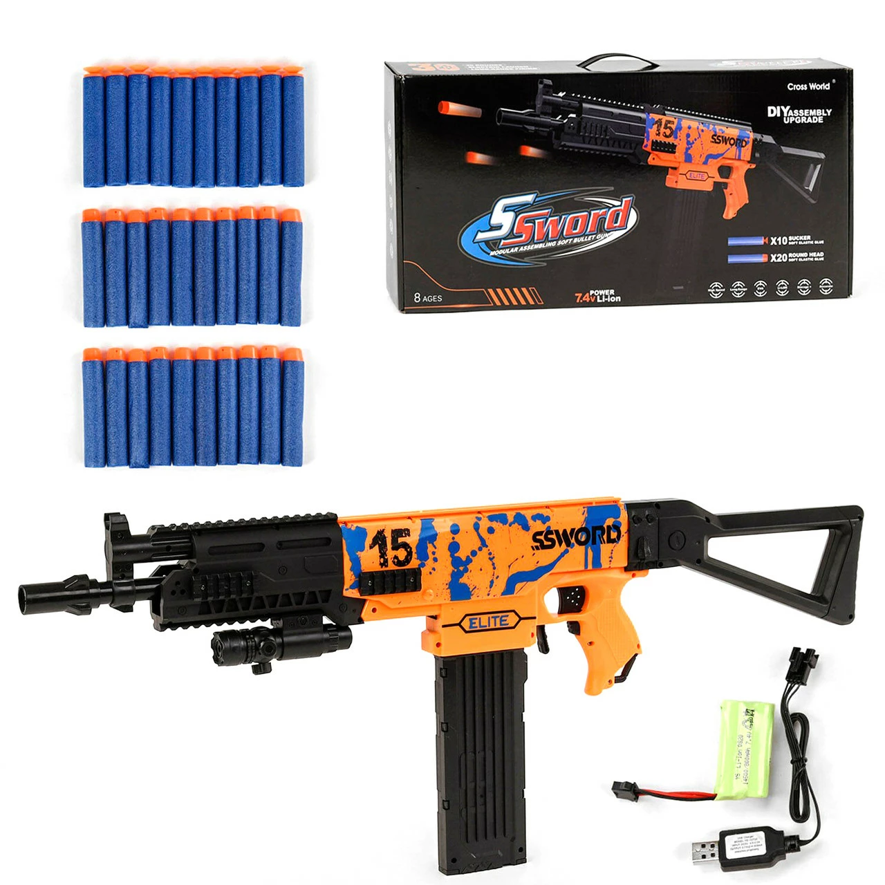 аккумулятор 7.4V. Данная модель автомата специально разработана для быстрых и активных ребят старше 6-ти лет, которые не боятся трудностей и готовы днями на пролет оттачивать огнестрельное мастерство. Конструкция автомата включает в себя: детализированное основание с вылитыми элементами декора, съемный магазин и лазерный прицел, удобную ручку с вылитым антискользящим рельефом, и крючком для карабина. Автомат работает от аккумулятора 7.4 V, чтобы совершить выстрел: