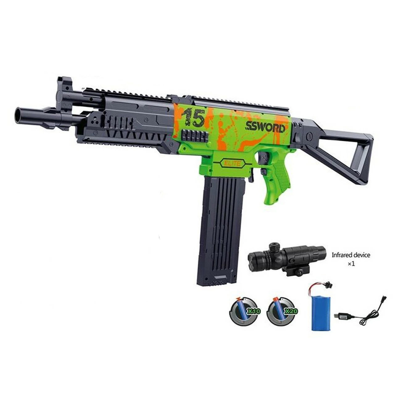 аккумулятор 7.4 V. Данная модель автомата специально разработана для быстрых и активных ребят старше 6-ти лет, которые не боятся трудностей и готовы днями на пролет оттачивать огнестрельное мастерство. Конструкция автомата включает в себя: детализированное основание с вылитыми элементами декора, съемный магазин и лазерный прицел, удобную ручку с вылитым антискользящим рельефом, и крючком для карабина. Автомат работает от аккумулятора 7.4 V, чтобы совершить выстрел:
