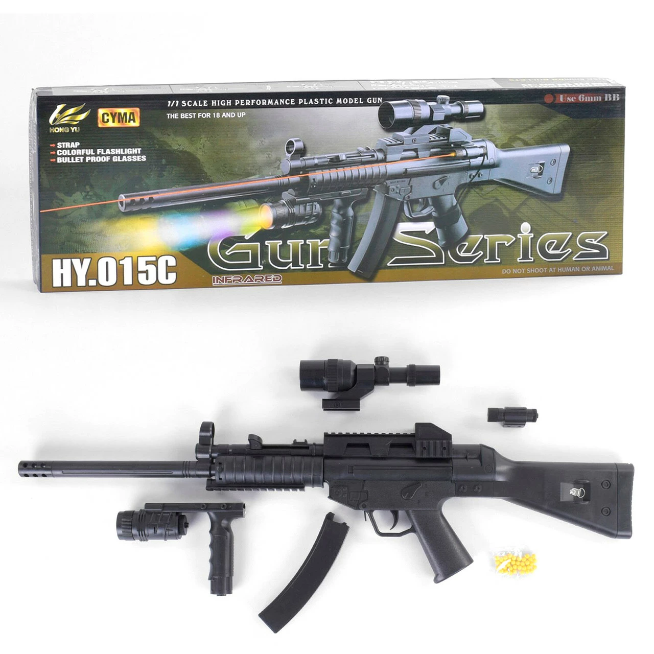 дополнительная ручка с фонариком. Автомат предназначен для стрельбы по мишеням. Соблюдайте технику безопасности, не стреляйте в людей и животных.