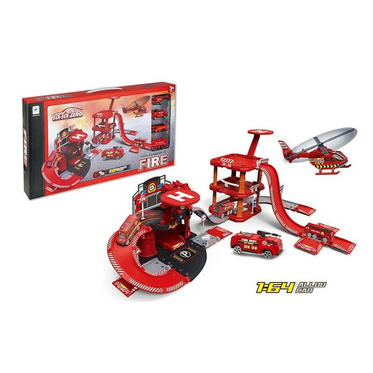 вторая - двухэтажная с крутым кольцевым спуском вниз и платформой для вертолёта. Набор представлен в красном и является стоянкой для полицейской спецтехники. В набор входит: