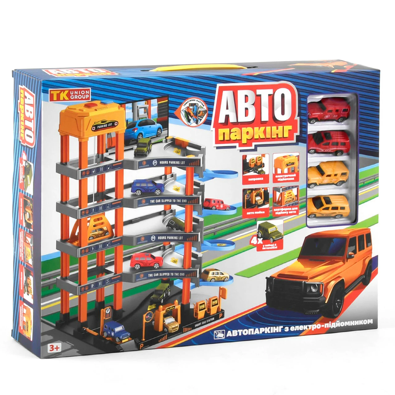 синяя опускает платформу. Авто парковка собирается из 22 деталей за 5 шагов. Также в набор входит четыре машинки в двух цветах - желтый и красный. Модели представлены легковым транспортом и фургоном, каждой модели по два цвета. Машинки оборудованы специальным металлическим колесиком, оно улучшает скольжение по винтовому спуску делая игру более интересной и увлекательной. Размер собранной парковки - 36.5х21.5х46.5 см. Комплектация набора: