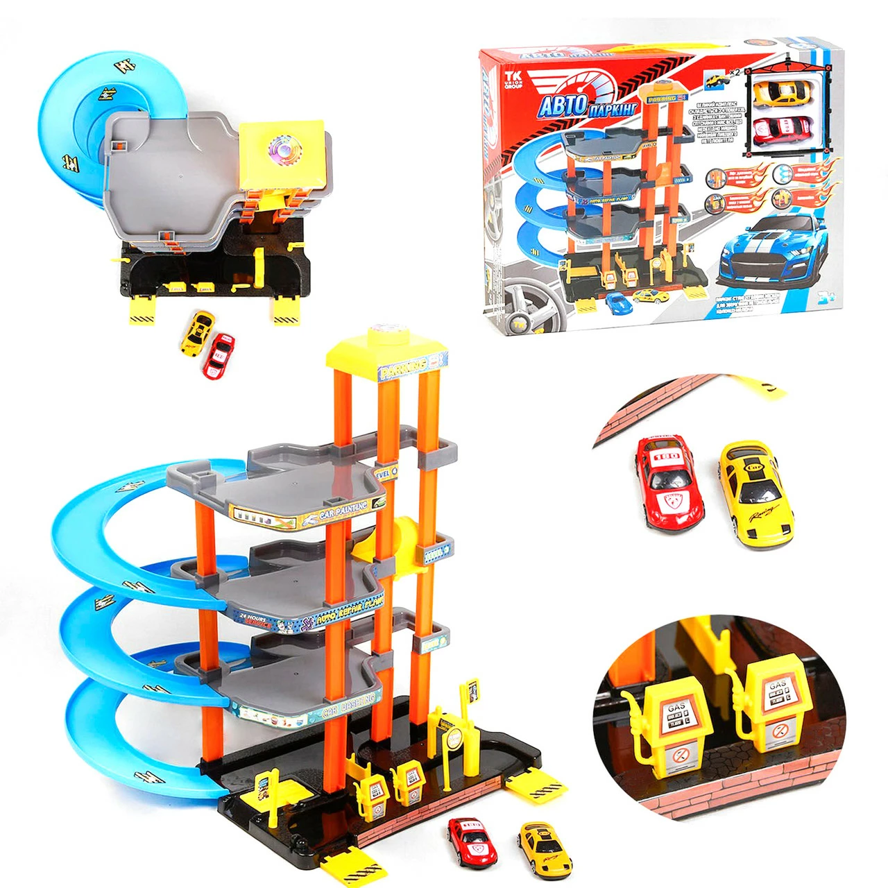 подъёмник. Авто парковка собирается из 38 деталей за 7 шагов. Также в набор входит две машинки - желтая и красная. Модели представлены легковым транспортом - гоночный спорткар и полицейская машина. Размер собранной парковки - 34.5х33.5х37 см. Комплектация набора ТК 7688 А-5: