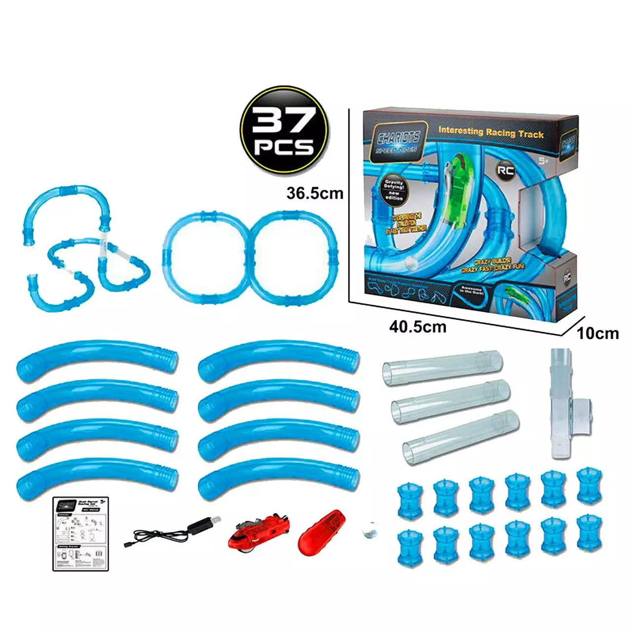 Оно служит для запуска на трассу гоночной машинки. Она отлично помещается в трубопровод, а пружинка на её крыше не дает ей болтаться в нём. Машина умеет ездить как назад, так и вперед за счет пульта. Работает транспортное средство от перезаряжаемого аккумулятора. Пульт функционирует от 2-х АА батареек. В комплект так же входит небольшой светящийся шарик, который машинка будет толкать по всему трубопроводу и создавать красочные световые эффекты. Комплектация (37 элементов):