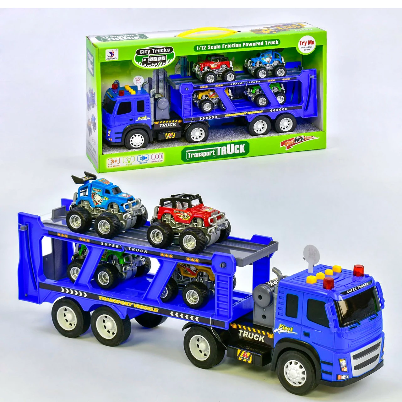 В набор машин Kimi входит автовоз и 4 внедорожника для перевозки.