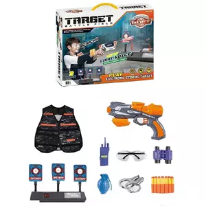 интереснейший набор состоит из пистолета, стреляющего мягкими пулями, набора поролоновых пуль, гранаты, наручников, защитных очков, бронежилета, рации, бинокля, автоматической мишени;