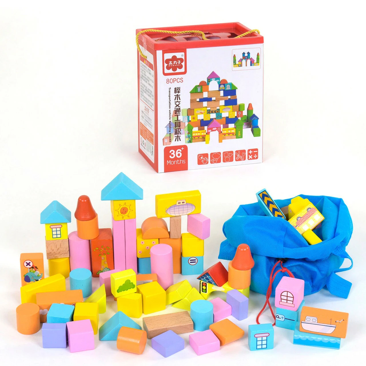 Деревянный конструктор на 80 деталей состоит из разноцветных