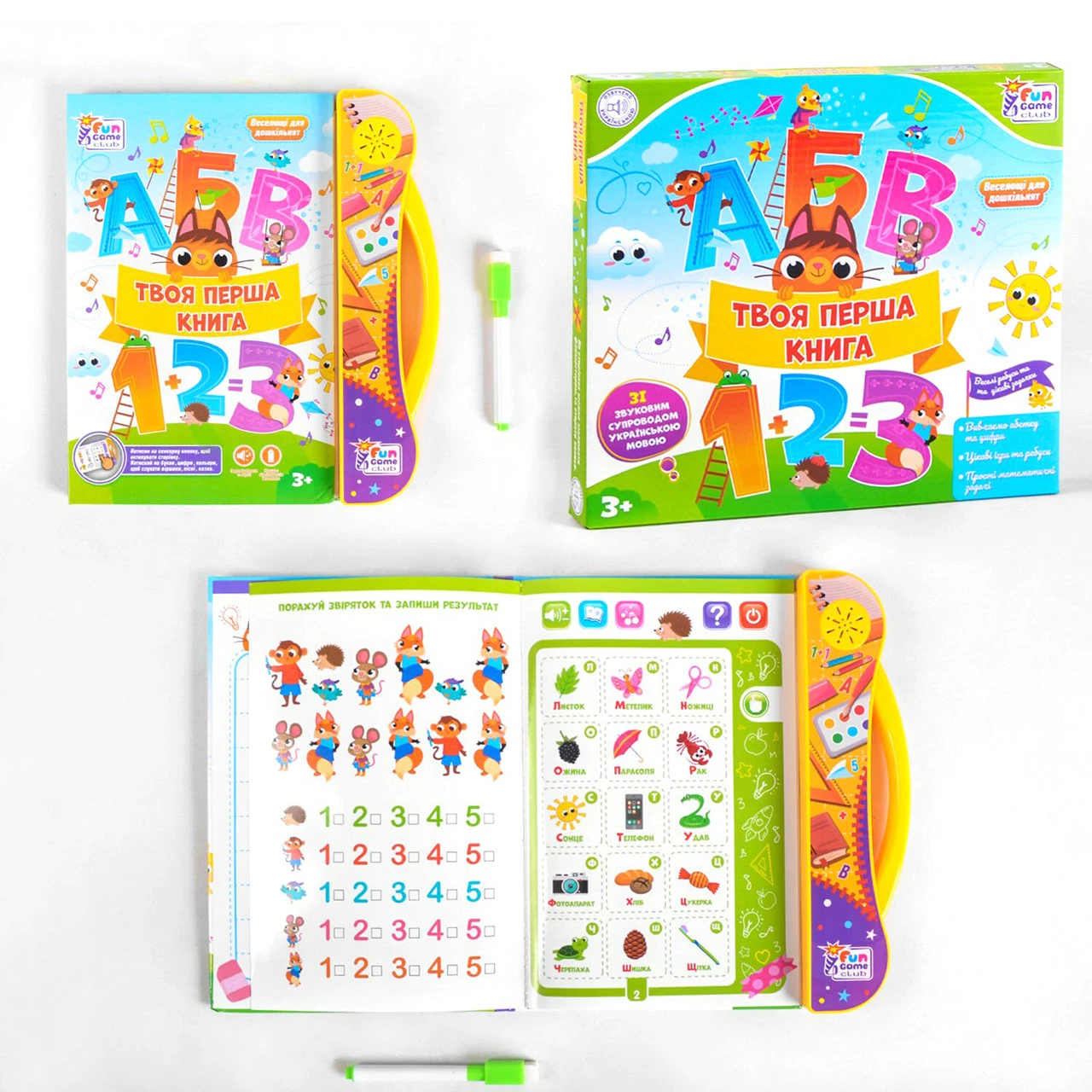 выключить/включить. Для того, чтоб активировать желаемую страницу, нужно нажать на сенсорную кнопку с изображением указательного пальца. Каждая страница содержит 15 иконок с разными изображениями, при нажатии которых можно услышать букву, цифру, фигуру, животное и стишок о нём. Первые странички научат ребенка алфавиту и нескольким слова, с третьей страницей малыш узнает о геометрических фигурах и цветах, с четвертой - о цифрах, на пятой изображены разные овощи, на шестой - фрукты, седьмая страница полна разных транспортных средств, а на восьмой, девятой и десятой изображены дикие, сельскохозяйственные и подводные животные. С такой обучающей и забавной книжкой малыш будет постепенно изучать окружающий мир и у него не будет времени скучать! Количество листов: 10. Язык озвучивания: украинский. Книжка работает от 3-х батареек типа АА (в комплект не входят).