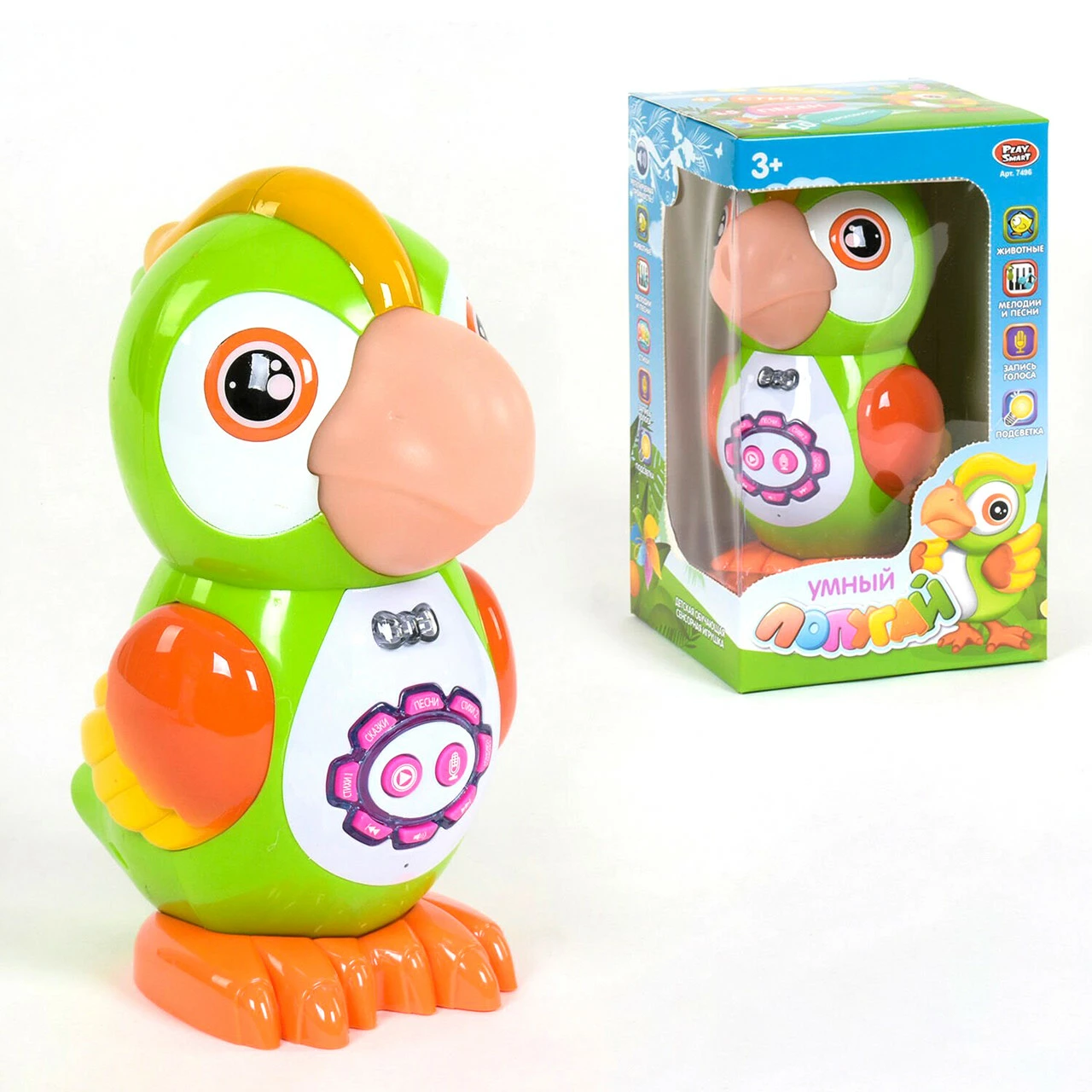 10 скороговорок. 5. Светящийся галстук попугай одет очень красиво, ведь у него есть светящийся галстук. Малышу это очень понравится. Также "Умный попугай" обладает интересной функцией Запись голоса и может стать настоящим попугаем-повторюшкой. Громкость звуковых эффектов можно регулировать. Язык озвучивания: русский. Работает от 3-х батареек 1,5 АА (не входят в комплект). Инструкция на русском языке в комплекте.