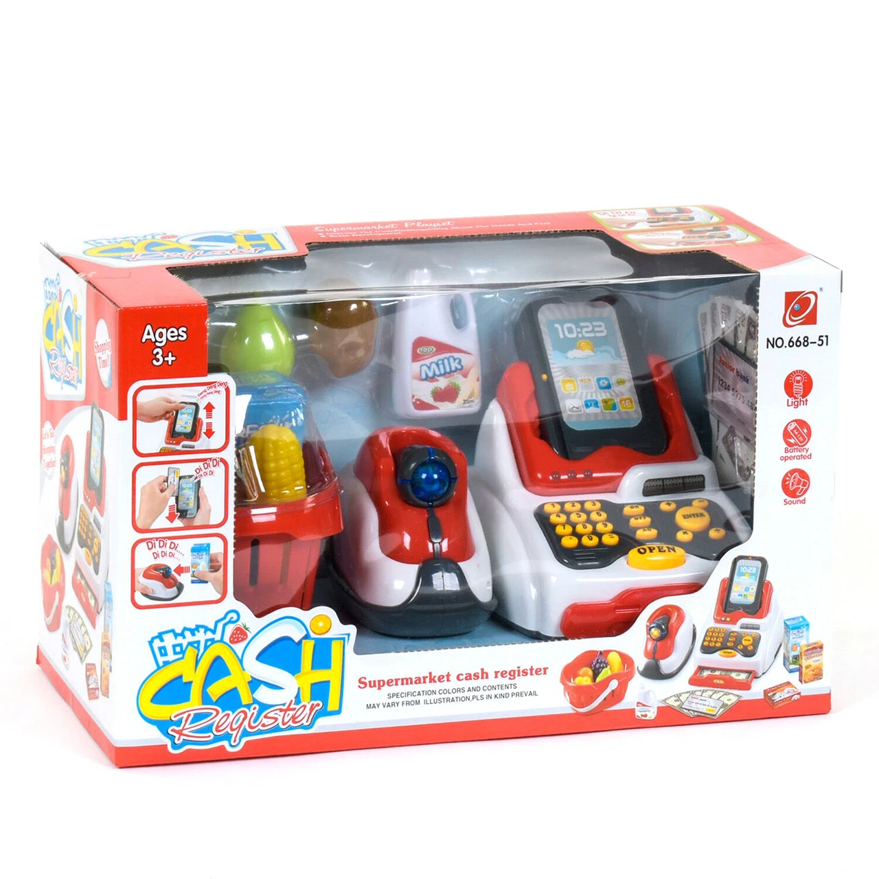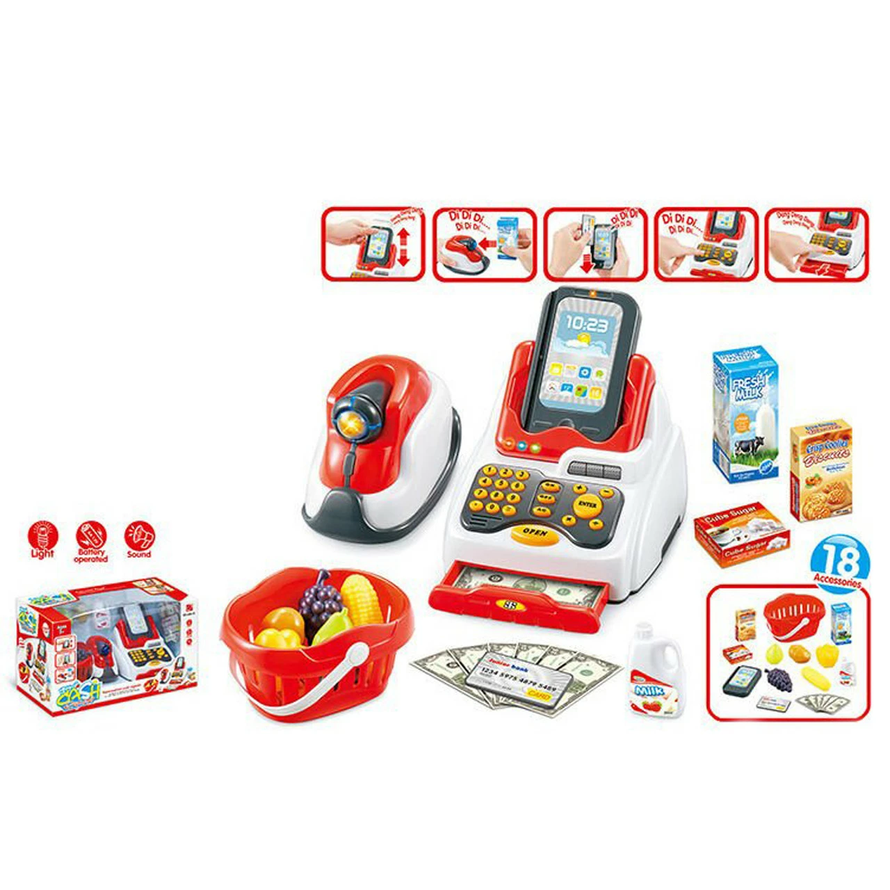 кнопки кассы со световыми и звуковыми эффектами. Касса с деньгами откроется только после нажатия соответствующей кнопки. Также в наборе присутствует функциональная платежная карта и деньги. Чтобы играть было еще интереснее в комплекте вы найдете целый набор свежих продуктов в корзинке. Сканер работает от 2-х батареек типа АА 1.5V (не входят в комплект). Кассовый аппарат работает от 2-х батареек типа АА 1.5V (не входят в комплект). Слот для карты работает от батареек, которые входят в комплект.