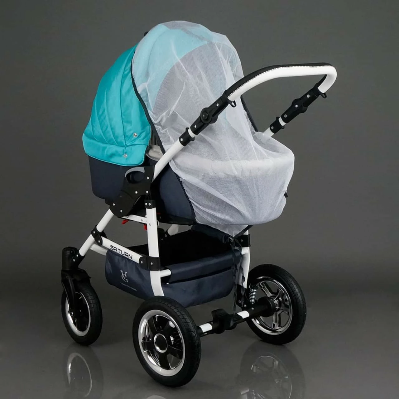 • пятиточечные ремни безопасности, которые оснащены мягкими накладками для плеч. Надувные колеса довольно крупные, что позволяет коляске ездить по разным дорогам. Передние колеса немного меньше задних, обладают поворотным механизмом с фиксатором. Коляска оснащена центральным тормозом. Подвеска шасси обладает двумя уровнями регуляции жесткости амортизации. Коляска Saturn 3 максимально удобна для родителей. Складное шасси позволяет легко транспортировать коляску, ручка управления регулируется по высоте. Размеры коляски.