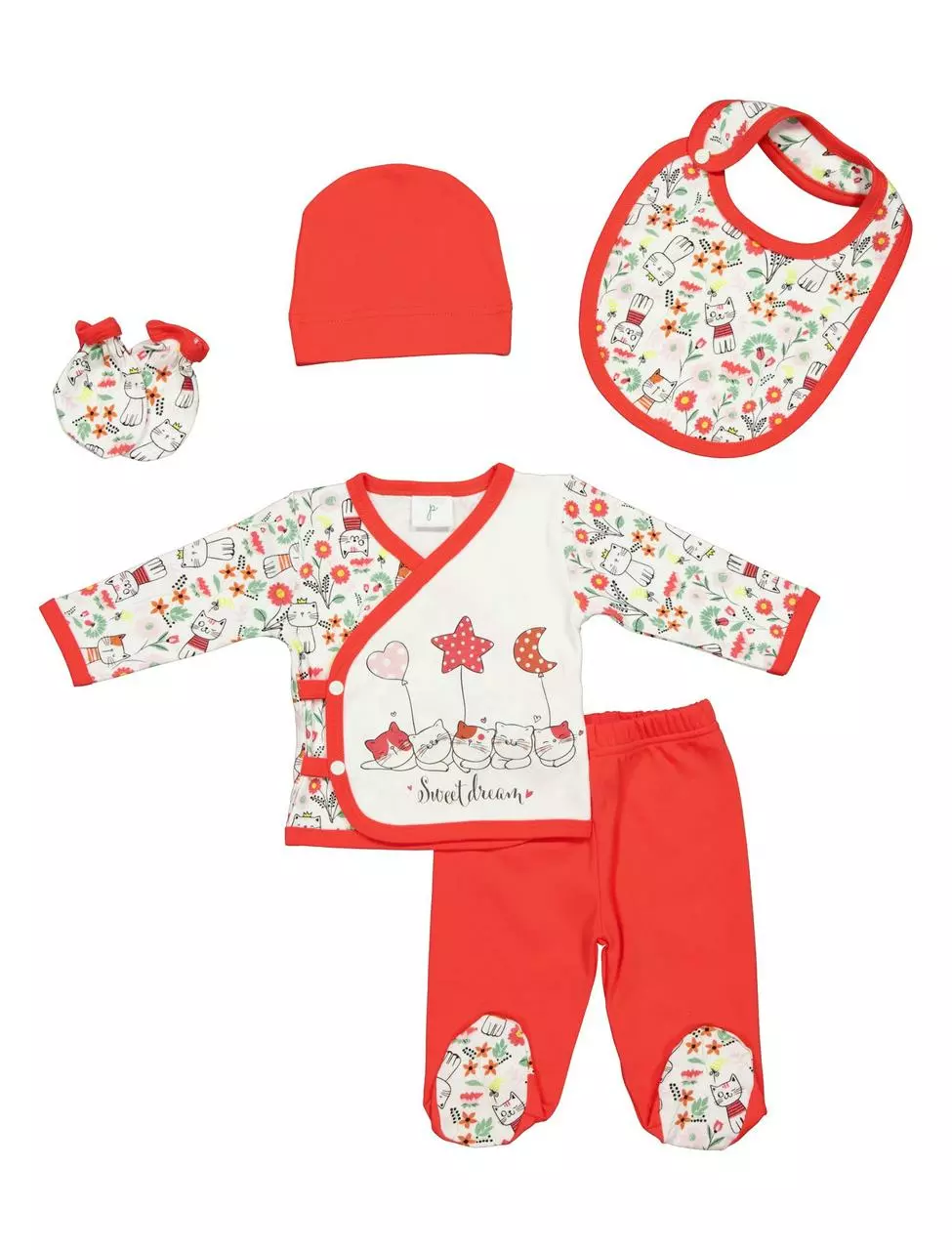 - Состав комплекта: Распашонка|Слюнявчик|Царапки|Шапка|Штаны