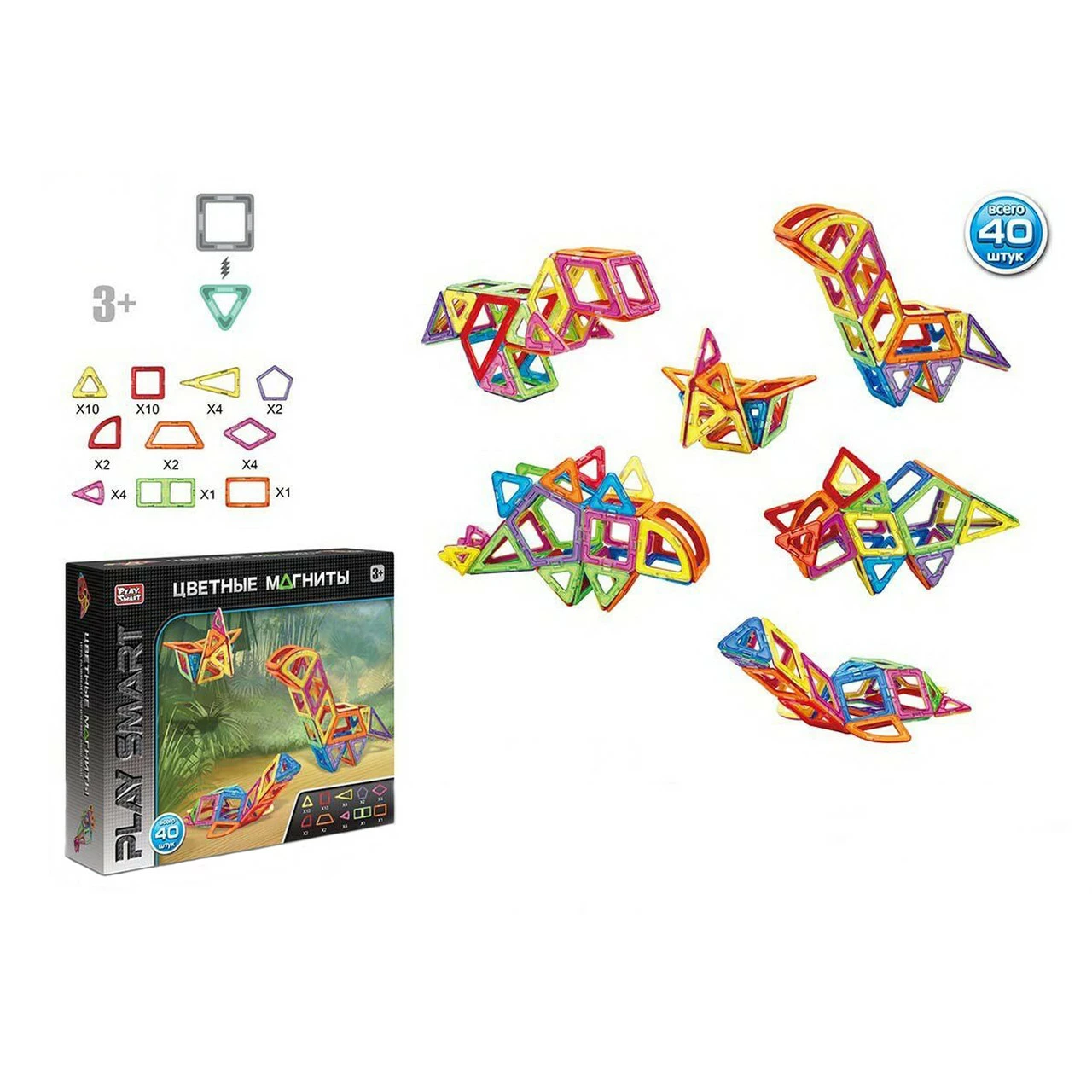 - 3 вида хищников. Главная особенность набора заключается в способе крепления. Магнит спрятан в яркий пластик, что позволяет надежно крепить детали между собой. В набор входит специальная инструкция - книжка с идеями. В ней собраны все модели и наглядно представлено из каких деталей они собираются. Также благодаря такой книжечки ребенок больше узнает о рептилиях, в какой период они жили, их внешний вид и особенности каждого вида. Комплектация набора: