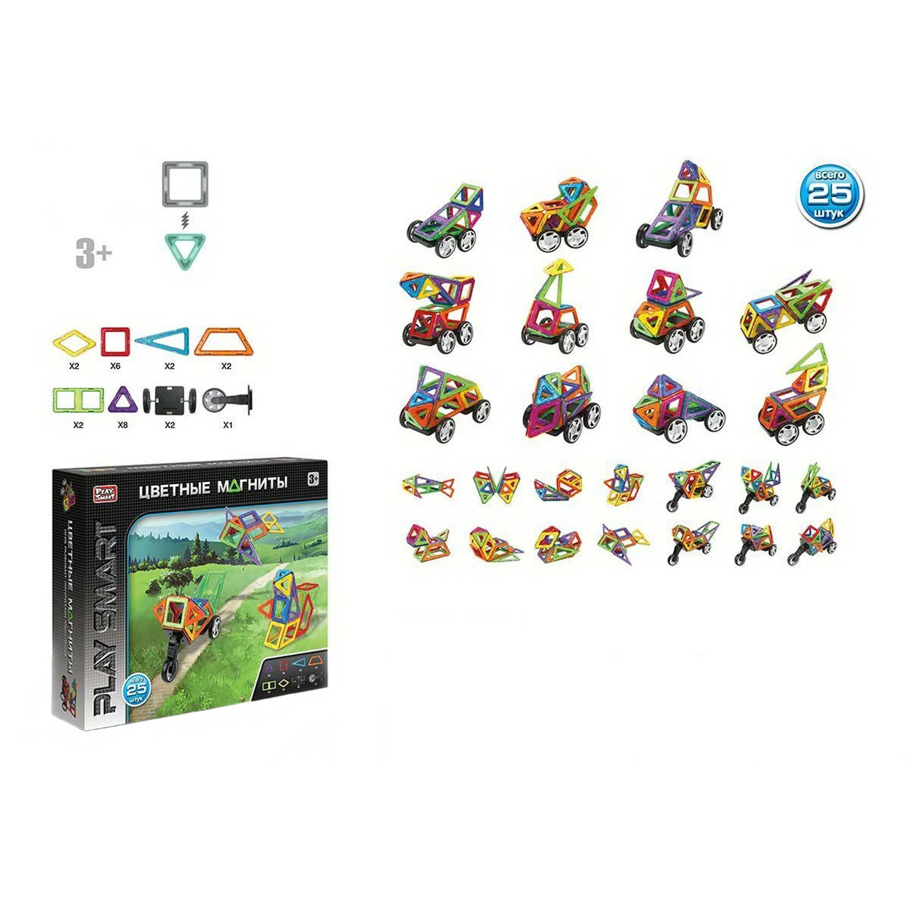 - 11 видов машин. Главная особенность набора заключается в способе крепления. Магнит спрятан в яркий пластик, что позволяет надежно крепить детали между собой. Еще одна уникальная составляющая набора - это колесный мото блок. Его можно регулировать по углу наклона. В набор входит специальная инструкция - книжка с идеями. В ней собраны все модели и наглядно представлено из каких деталей они собираются. Комплектация набора: