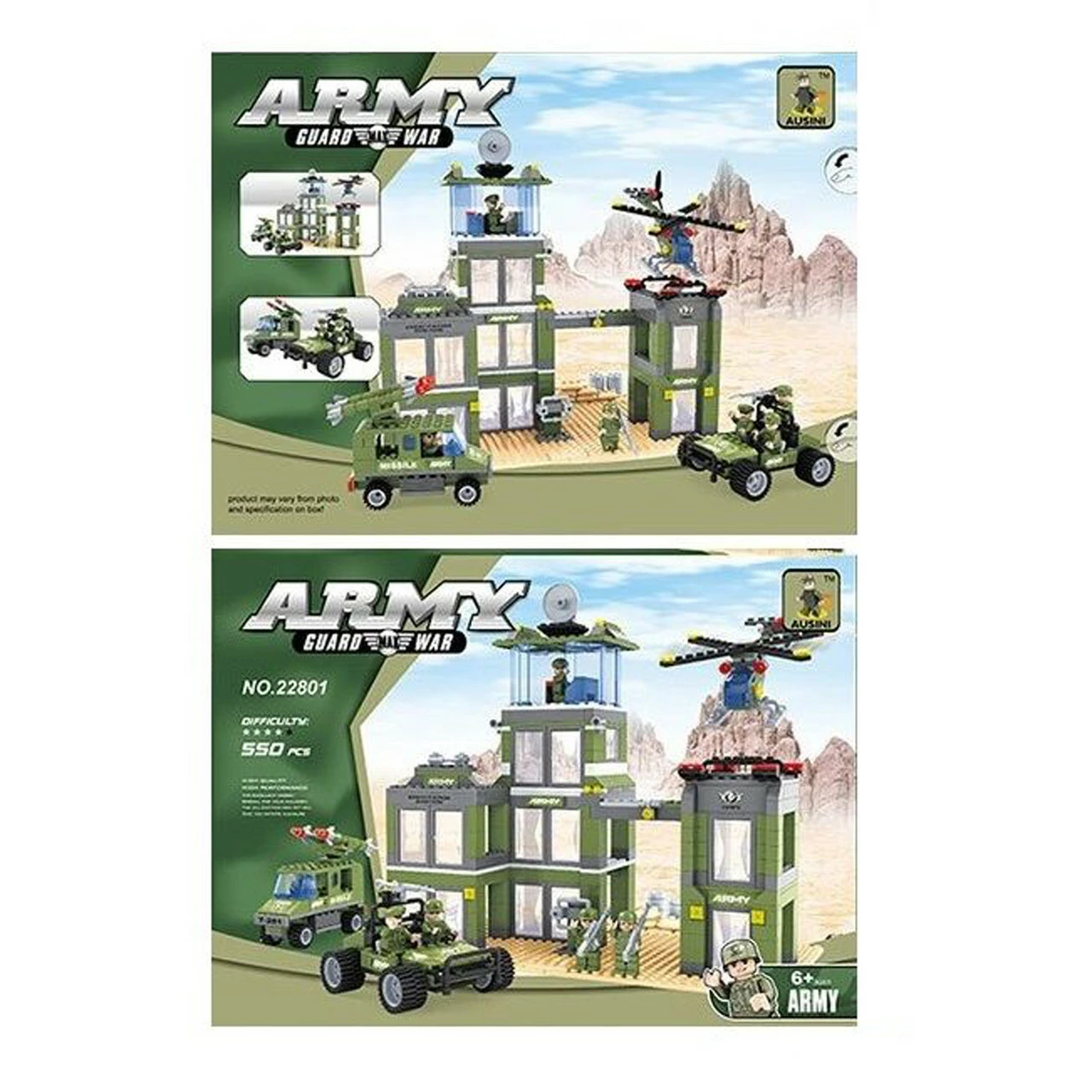 Герои в наборе - 6 фигурок военных. Конструктор Kimi - это современный набор для увлекательных сюжетов с военной тематикой! В набор входит 550 детали из которых ребенок сможет собрать военную постановку со специализированной базой. Большое помещение насчитывает в своей конструкции 3 этажа, смотровую вышку и посадочное место для вертолета. Также здание насчитывает 7 просторных комнат с прозрачными окнами и дверьми. Собирается военная постройка за 24 шага. Военная машина собирается за 6 шагов. Зенитная установка собирается за 7 шагов. Вертолет собирается за 6 шагов. Уровень сложности - 4. Комплектация набора: