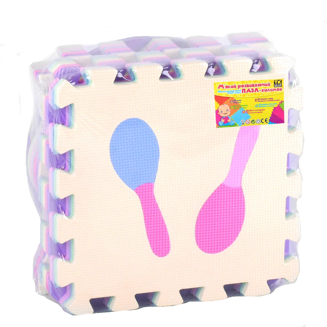 Один круг поделён на 4 части. Они легко скрепляются между собой и надежно фиксируются друг с другом. На каждом элементе изображен рисунок, выполнен он в контрастных цветах, что благоприятно влияет на развитие глаз, и оснащен простым и понятным изображением. Модели этой серии отличаются повышенной износоустойчивостью. EVA – это современный экологически чистый материал. Он имеет микропористую структуру закрытоячеистого типа. Обладает рядом весомых преимуществ: