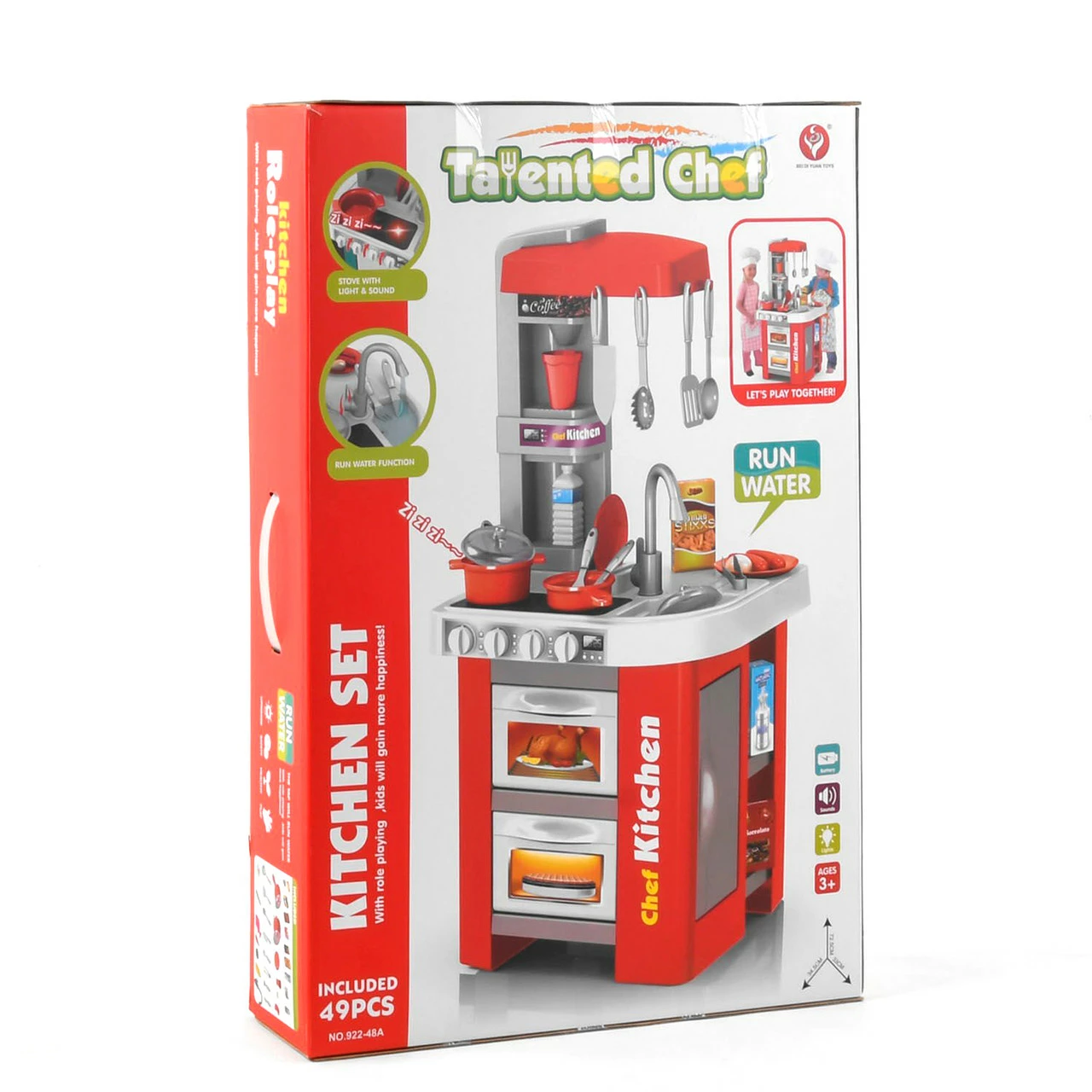 8 кухонных столовых приборов. Кухонная стойка включает в себя реалистичные звуки приготовления пищи, а сама конфорка при активации подсвечивается желтым светом. Стойка работает от 3х батареек типа ААА (в комплект не входят).