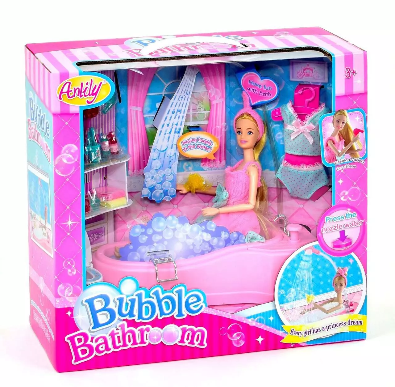 Игровой набор представляет собой ванную комнату принцессы. Кукла с
