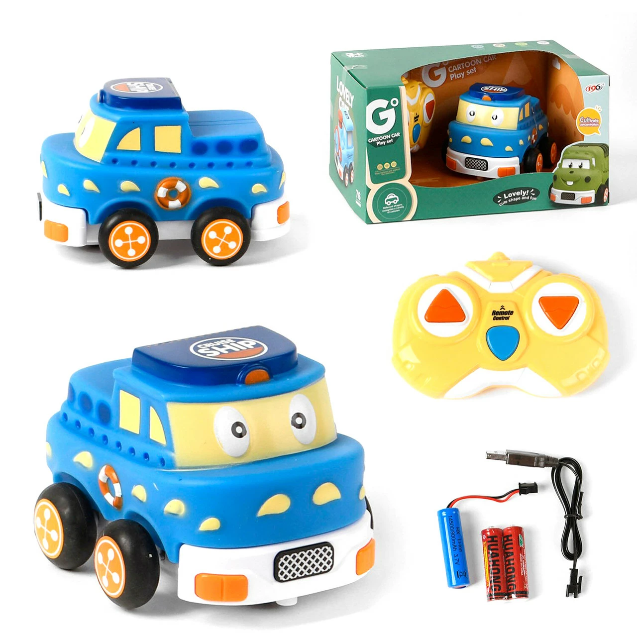 простота в управлении. Автомобиль окрашен в пастельный голубой цвет и дополнен по всему корпусу контрастными белыми, оранжевыми и черными вставками. Круглые выразительные глазки машинки нарисованы на лобовом стекле, а ротик - это часть капота. Управление: