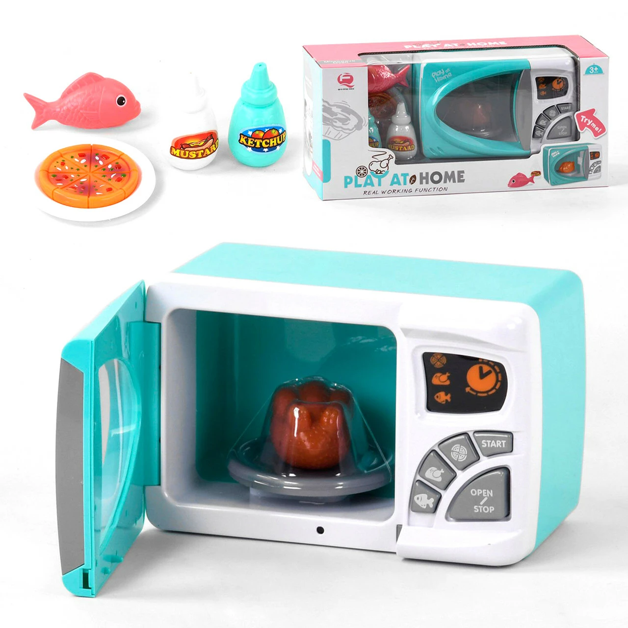 внутри загорится свет и тарелка с едой начнет вращаться. Когда