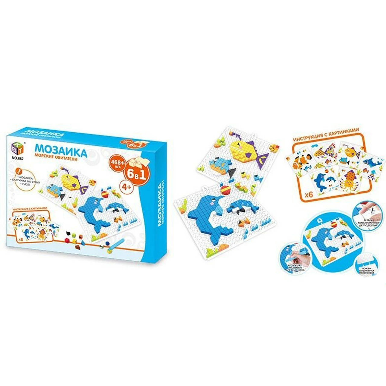 тренировать усидчивость; В наборе 468+ элементов. Комплект предусматривает 6 схем сборки мозаики, также ребенок сможет составлять картинки используя собственную фантазию и воображение.