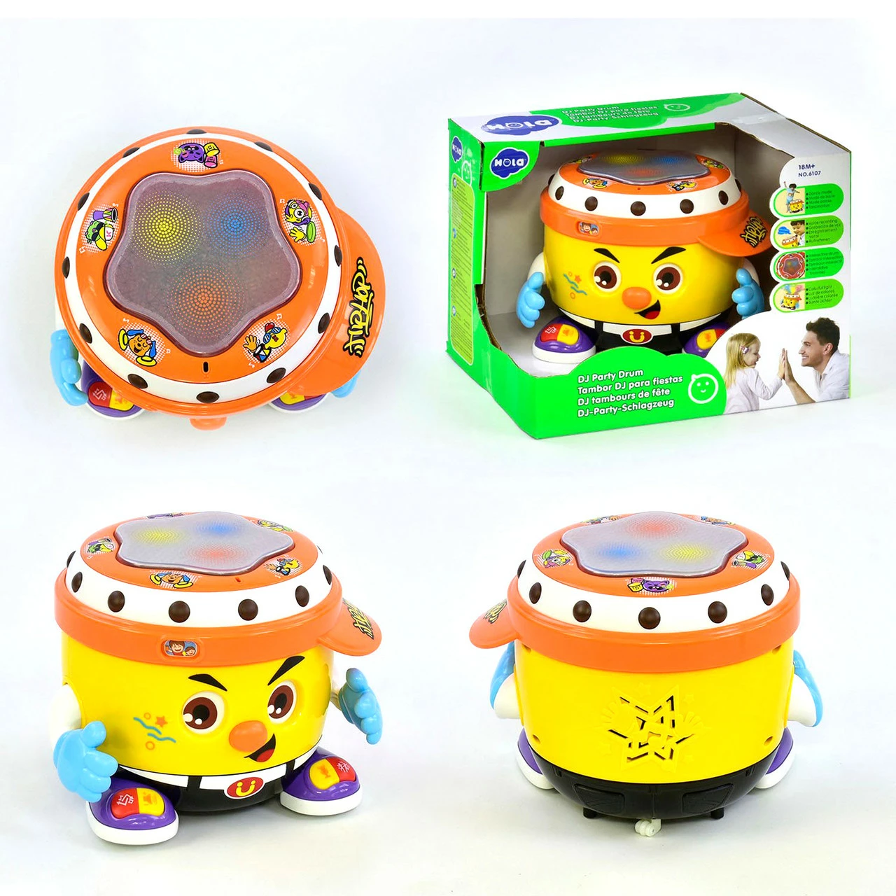 1. Режим барабана. Игрушка светиться и воспроизводит ритмичные мелодии в 4 стилях. По периметру верхней панели установлены также кнопки, запускающие голоса животных. 2. Режим танцев. Также барабанчик умеет записывать голоса. Записывает до 4 слов и воспроизводит их, накладывая на ритмичную музыку. Работает от батареек: 5 батареек 1.5V "АА" (не входят в комплект).