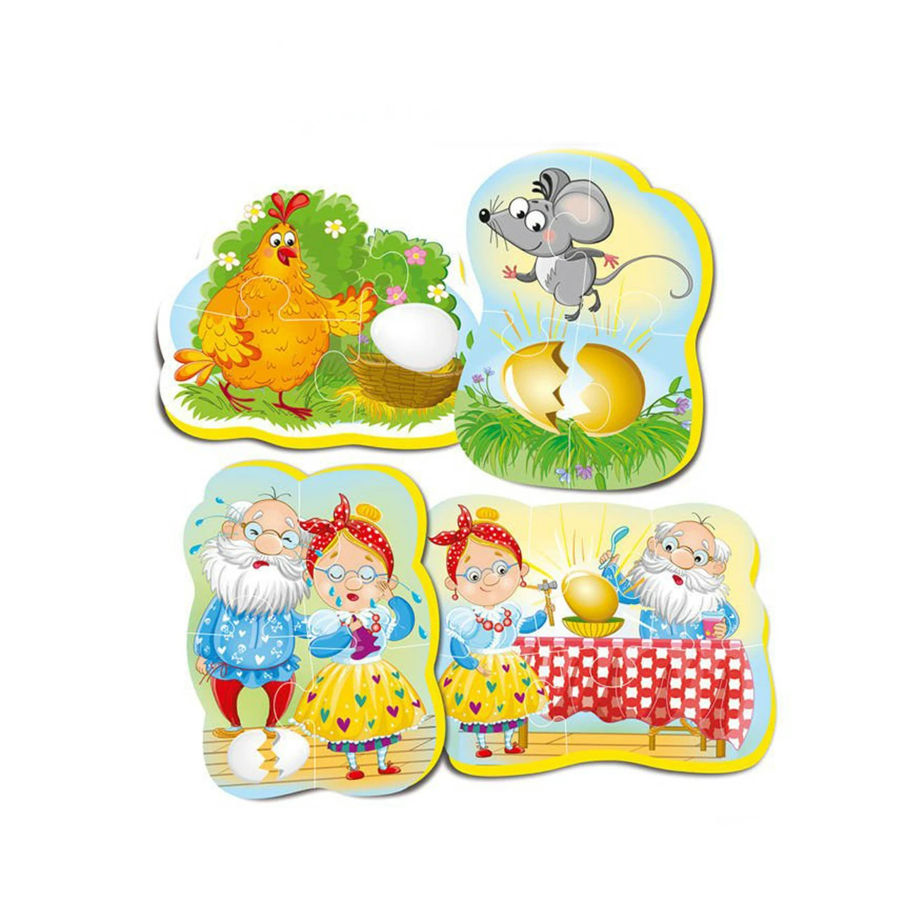В наборе детских пазлов Kimi "Курочка ряба" 4 картинки. На каждой