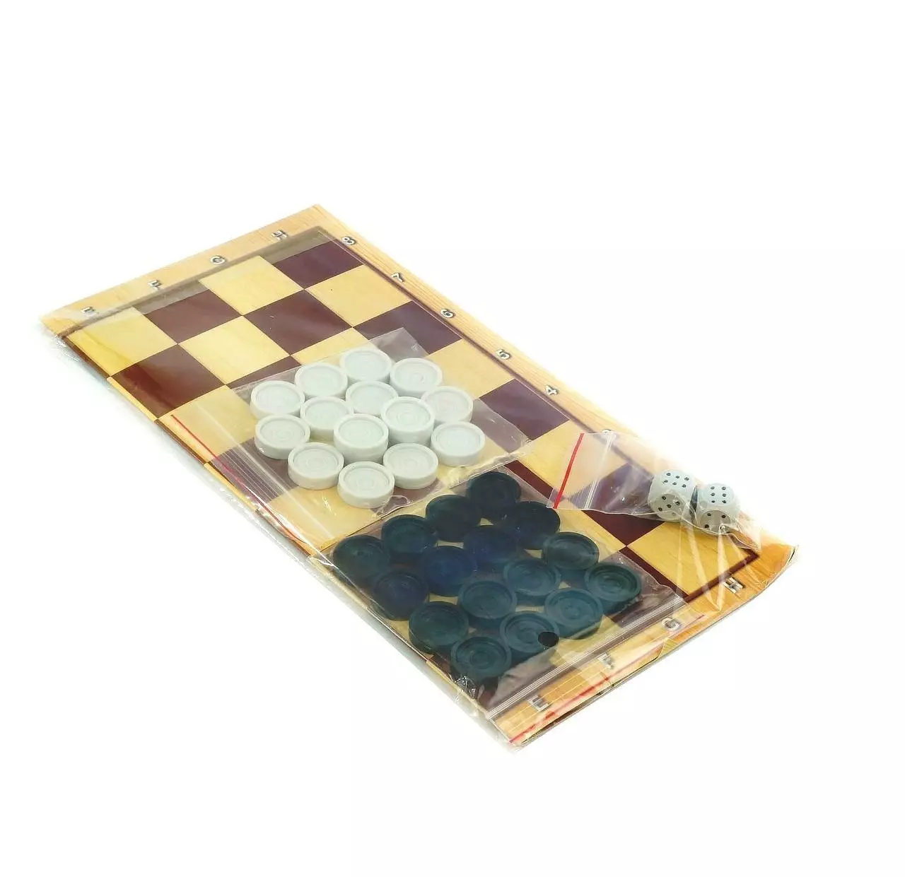 гравировкой шахматных фигур с одной стороный, 2 игральные кости.