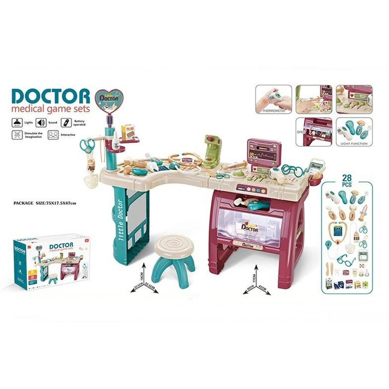 в игровой набор входит 28 разнообразных медицинских аксессуаров;