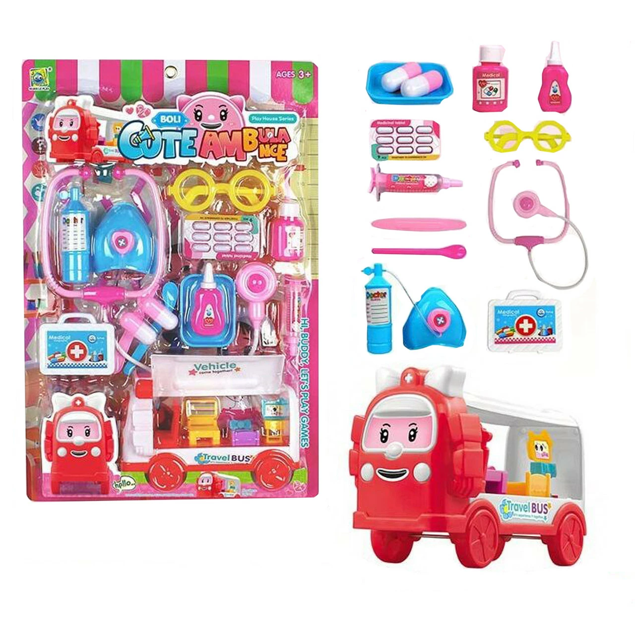 выполнена из первичного пластика и окрашена в яркие цвета. Стильный комплект настоящего доктора выполнен в современном и умилительном дизайне. Обширный набор врача однозначно впечатлит юного доктора своими разнообразными аксессуарами и деталями. Помимо классического медицинского оборудование как стетоскоп, шприц, медикаменты, маска и т.д., в наборе также есть большой автобус для путешествий с мебелью! Комплектация: