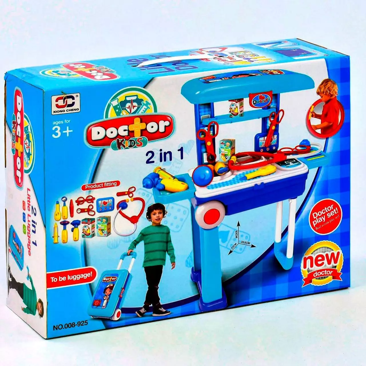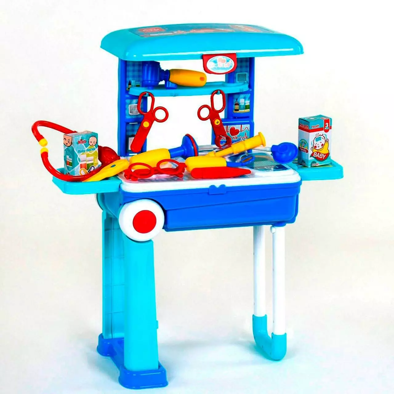 Увлекательная игра в доктора поможет малышам познакомиться с врачебными инструментами и преодолеть боязнь медицинских кабинетов. Врачебный столик складывается в удобный чемодан на колесиках с длинной ручкой.