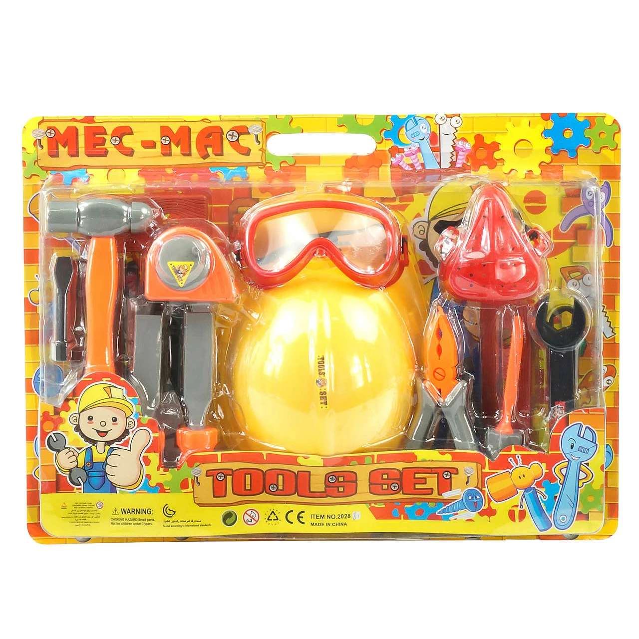 плоскогубцы. Все инструменты сделаны из первичной пластмассы и окрашены в желтый, оранжевый, черный и красный цвета с серыми деталями.