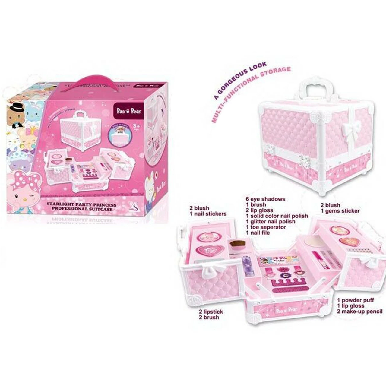 - косметичка выполнена из первичного пластика розового цвета, состоит из трёх раздвигающихся уровней. Раскрывая косметичку, перед вами открывается целое царство косметики. Три уровня, каждый из которых заполнен разными видами декоративной косметики: пудрами и румянами, помадами, блесками и карандашами, тенями, лаками для ногтей, кисточками и спонжиками, наклейками и переливающимися стразами. Это ли не счастье получить все это сразу в одном подарке! Дополнительным плюсом станет удобное и компактное хранение. Комплектация: