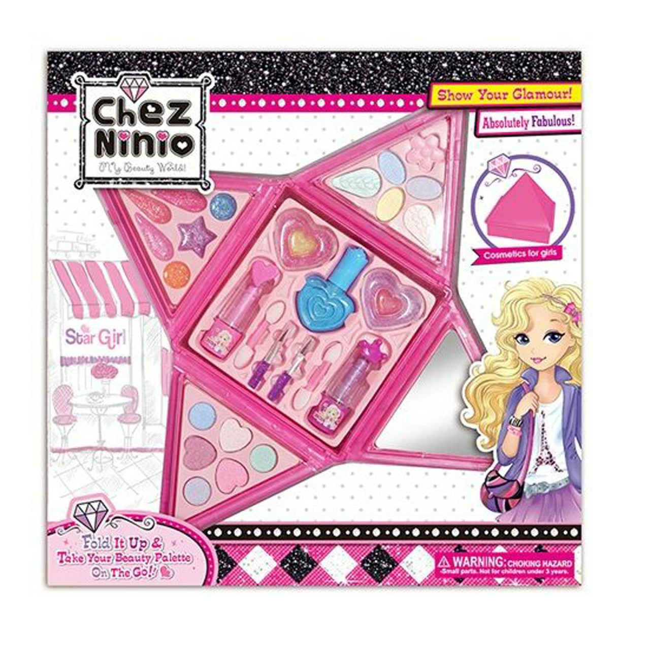 косметический набор сделан в виде пирамидки, грани которой закрываются, сохраняя косметику от грязи и пыли. В комплект входят: