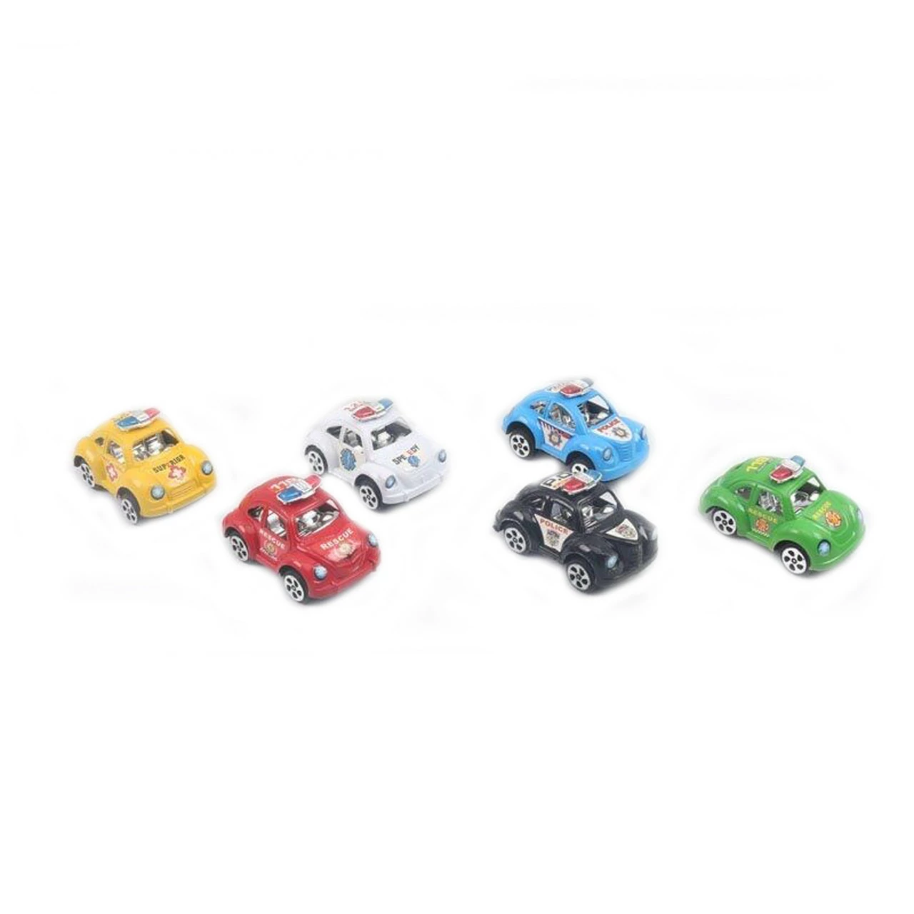 2 полиции черного и синего цвета. Машинки выполнены из пластика, а корпус украшен наклейками. Через окна хорошо просматривается салон, а на крыше установлена мигалка. Задние колеса оснащены инерционным механизмом. В наборе - 6 штук. Размер машинки - 8х5 см.