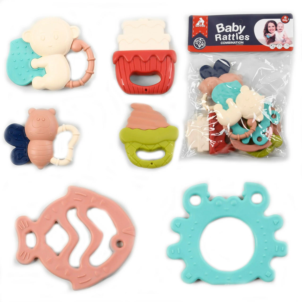 комплектацию включили 6 разнообразных фигурных погремушек: