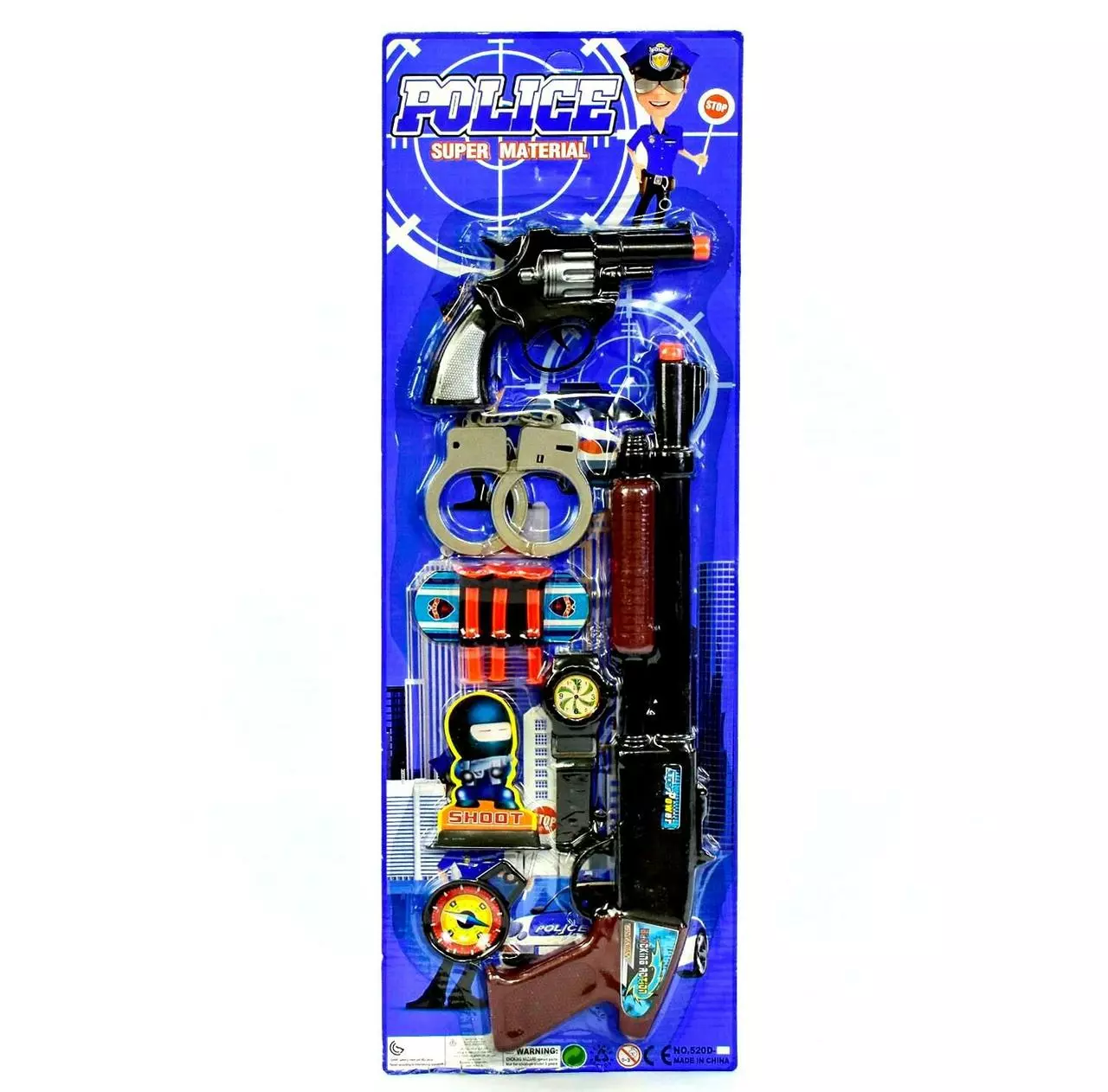 пистолет с присосками, наручники, часы, компас и мишень. Позвольте