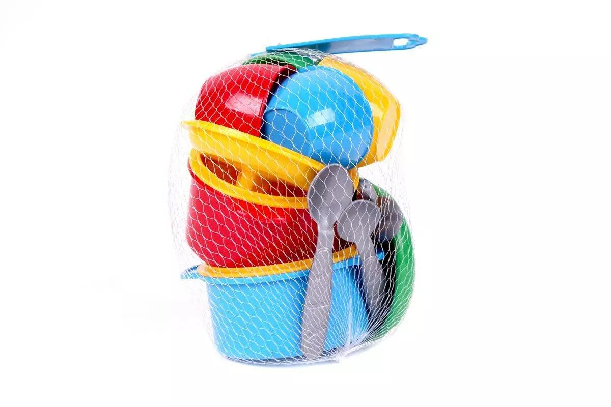 Комплект состоит из 4-х чашек, тарелок и ложек, 2-х кастрюль,