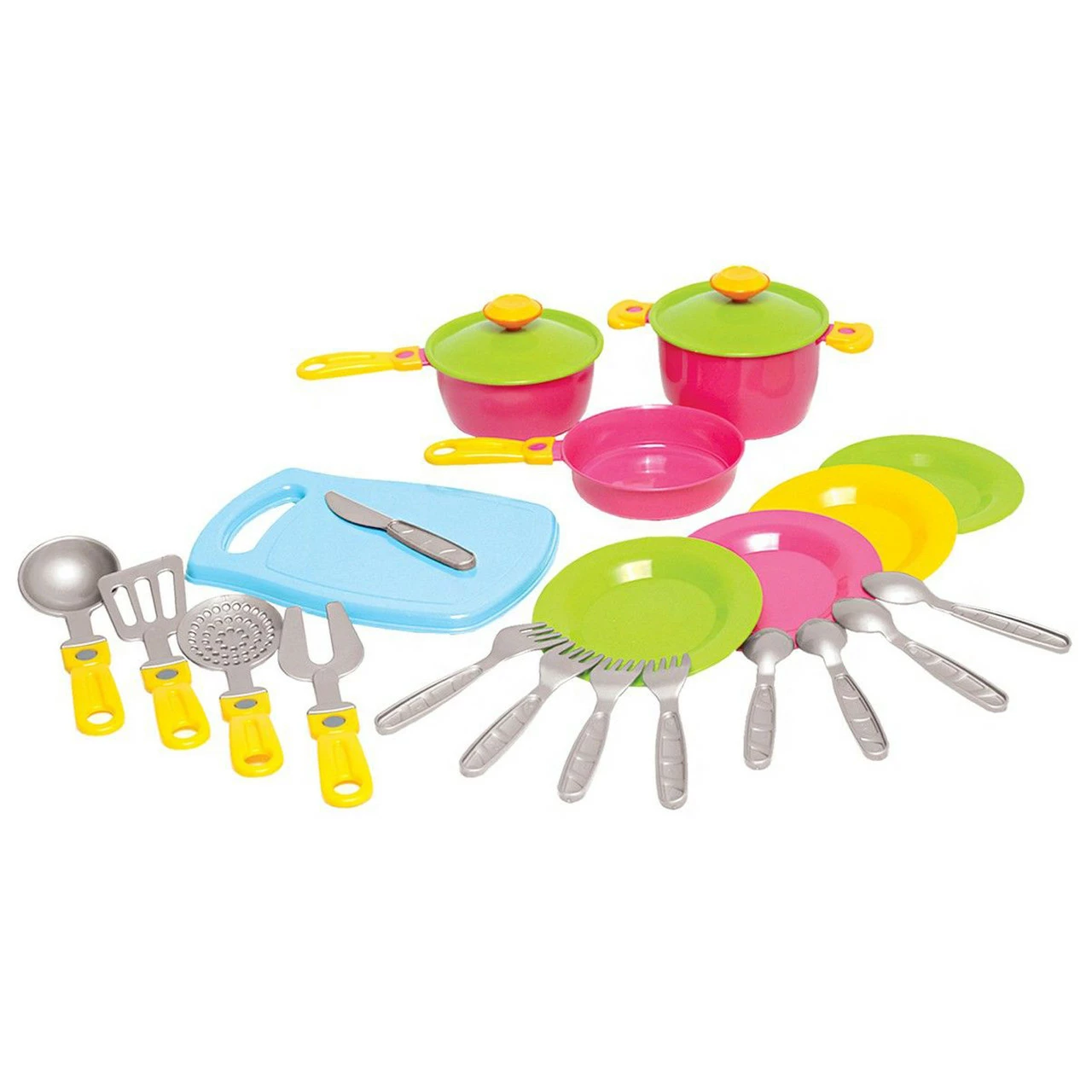 состоит из дощечки, кастрюли, сковородки, сотейника, вилок (4 шт.),