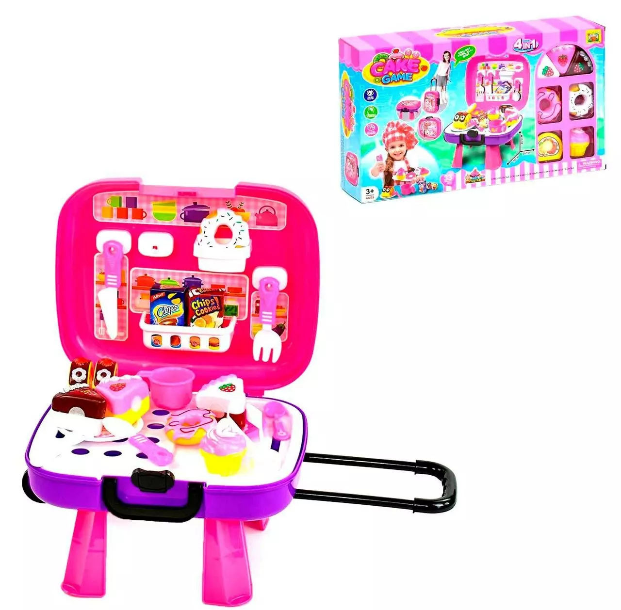 чемодан с выдвижной ручкой; набор пластиковой посуды; пончики,