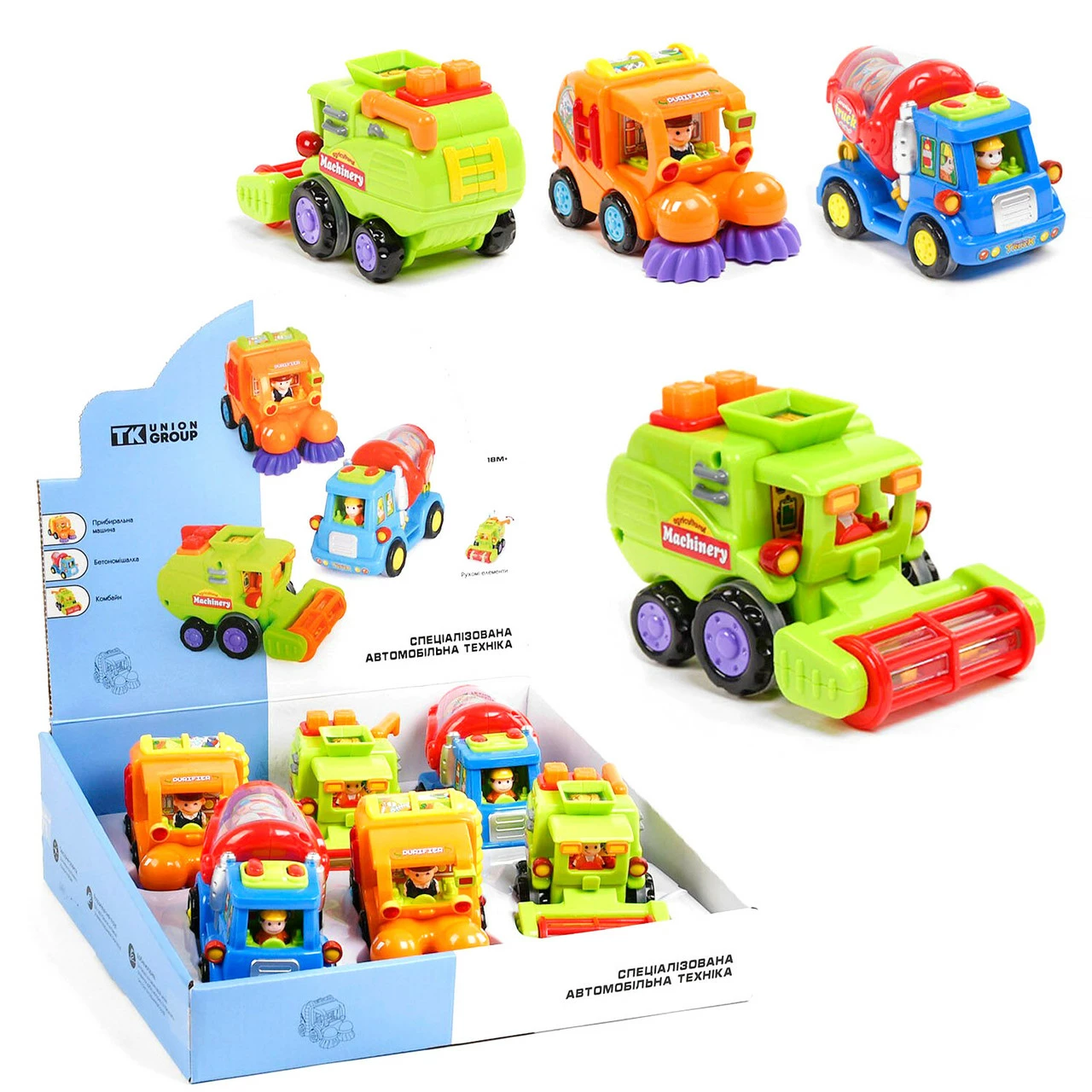 нажимаемые кнопки. За рулем каждой спецтехники сидит водитель в головном уборе и доброй улыбкой. В блоке 6 машинок.