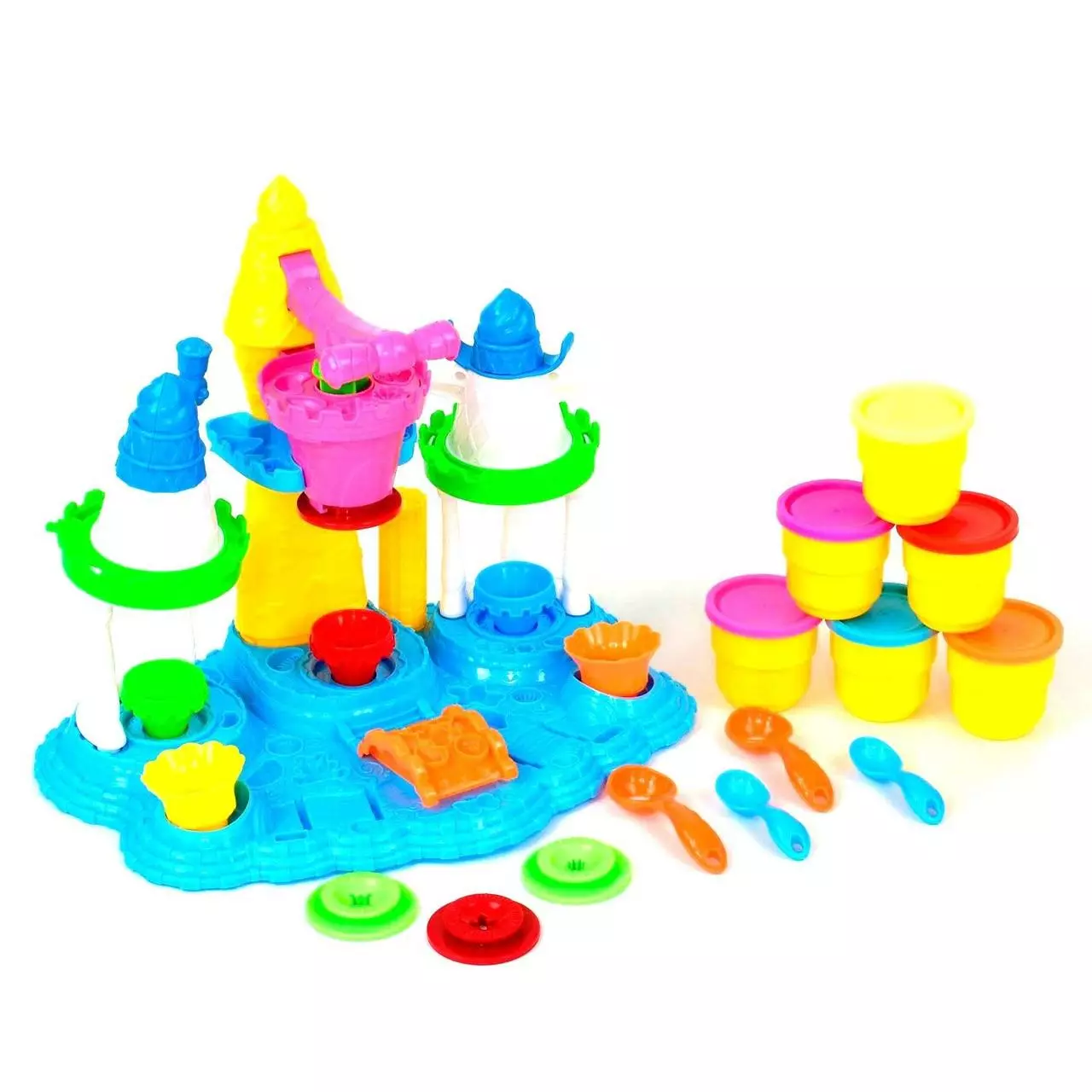 входит 6 баночек с разноцветным тестом для лепки, пресс в виде