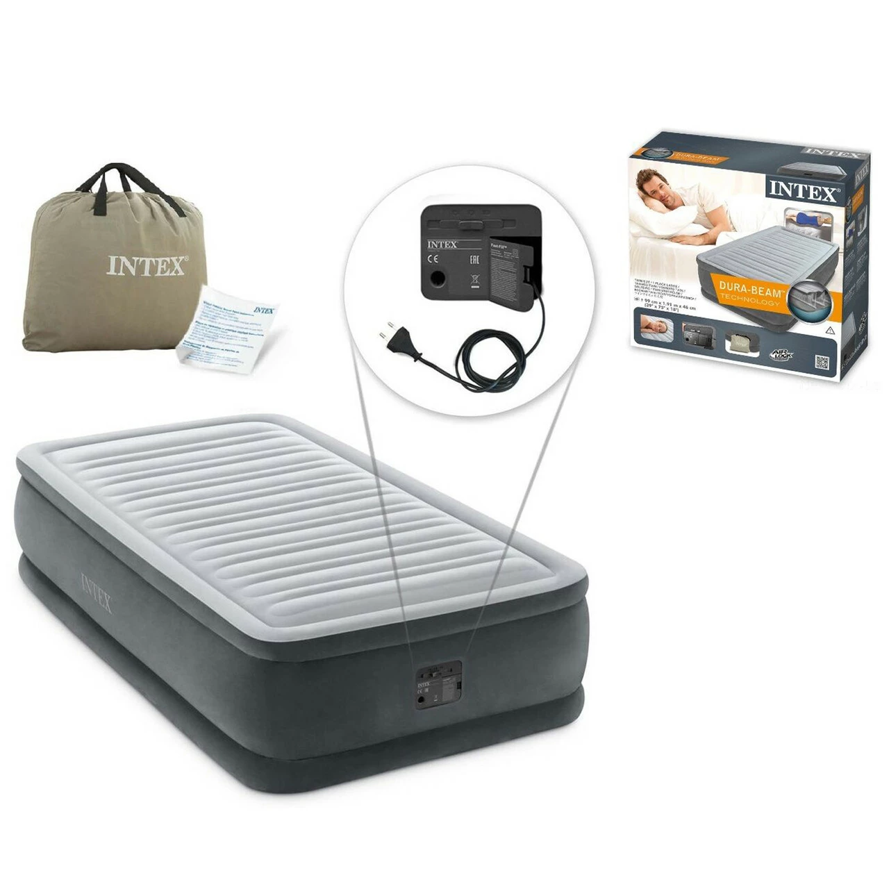 Надувной одноместный матрас Intex со встроенным электрическим насосом Серый 6941057417714