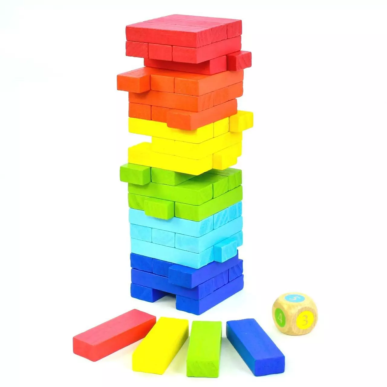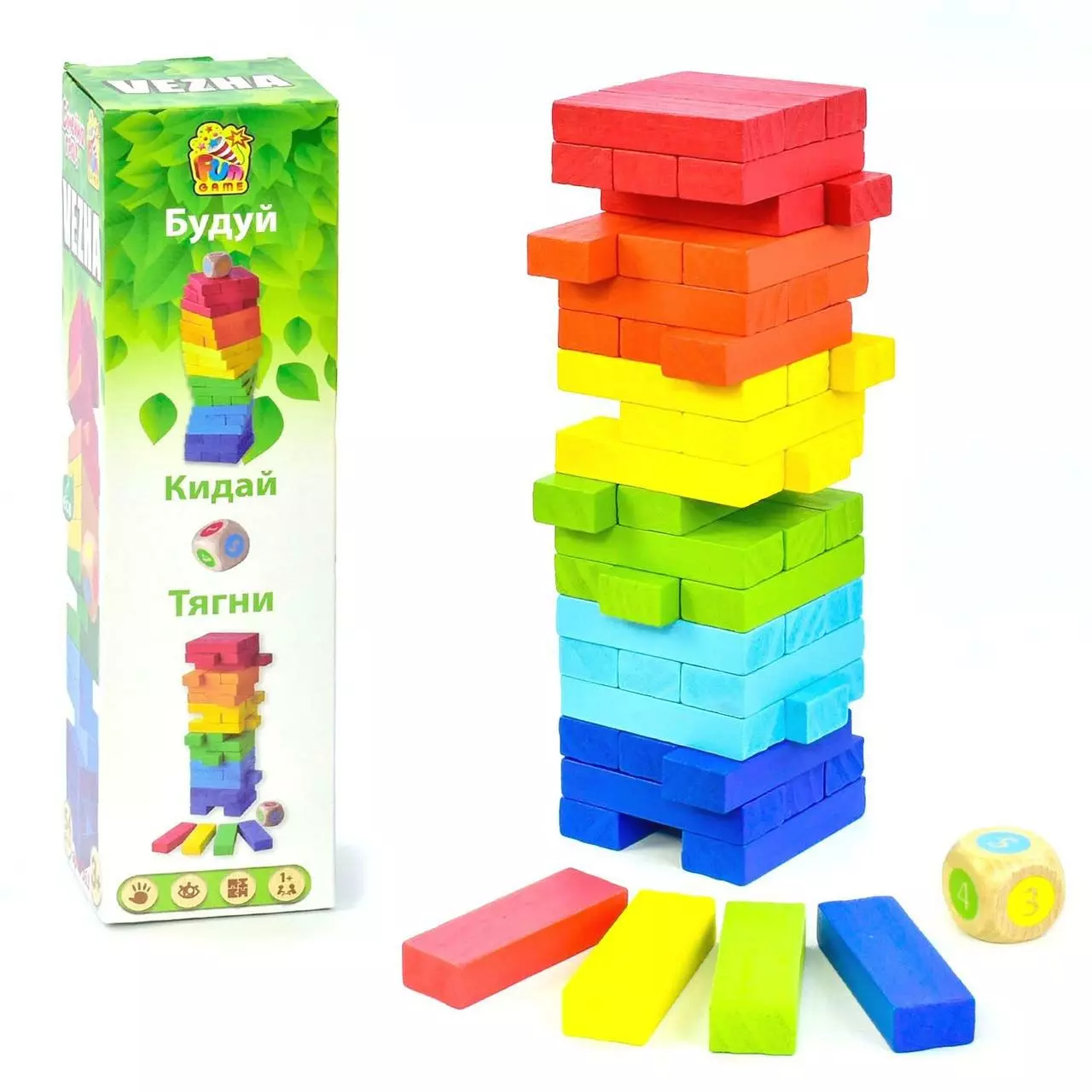 деревянные бруски различных цветов и кубик. Принцип игры прост.