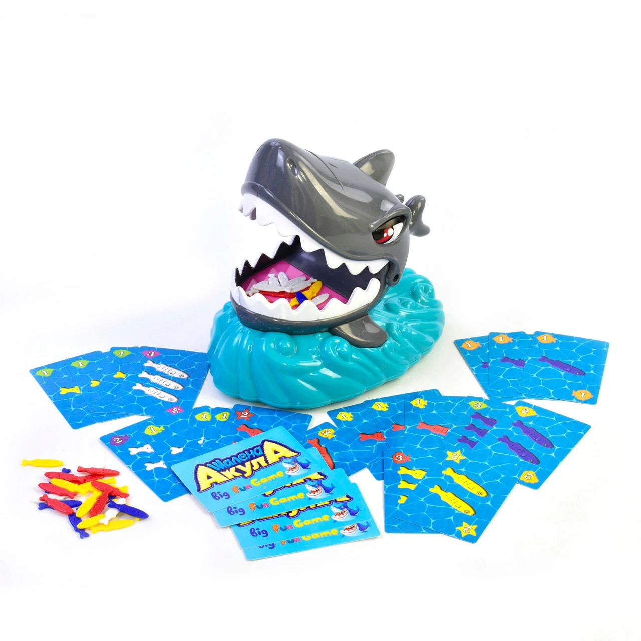 победителями! Комплектация: акула, карточки, рыбки. Акула работает