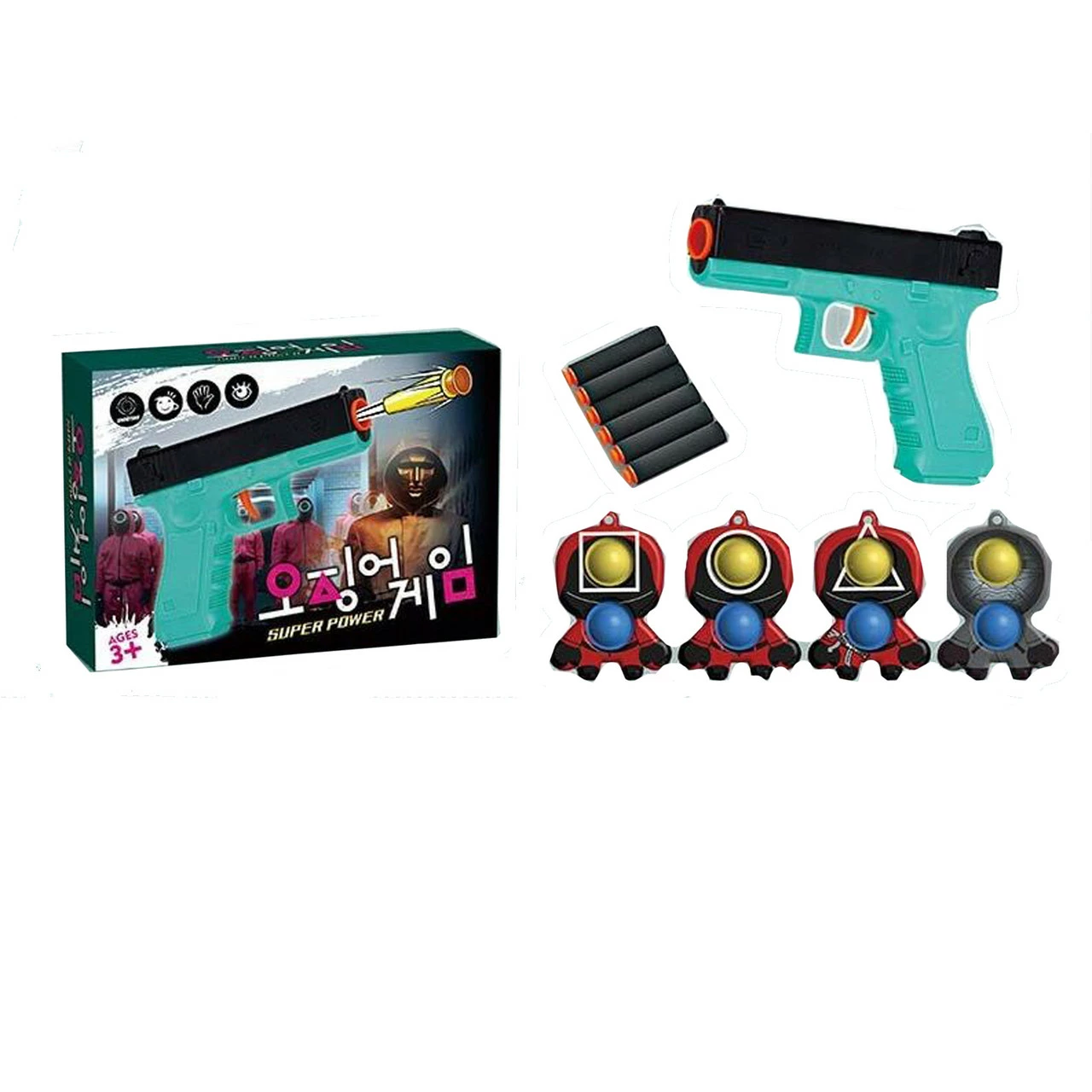 10 мягких патронов на присосках. Пистолет выполнен в классическом стиле и окрашен в бирюзовый цвет с контрастными черными вставками. Конструкция легкая и в то же время очень компактная, не занимает много места и послужит в качестве дополнительной или же основной защиты. Чтобы совершить меткий выстрел, зарядите пистолет пластмассовыми шариками и взведите курок. Набор выполнен из первичного пластика и окрашен высококачественными красками, которые абсолютно безопасны для здоровья ребенка.