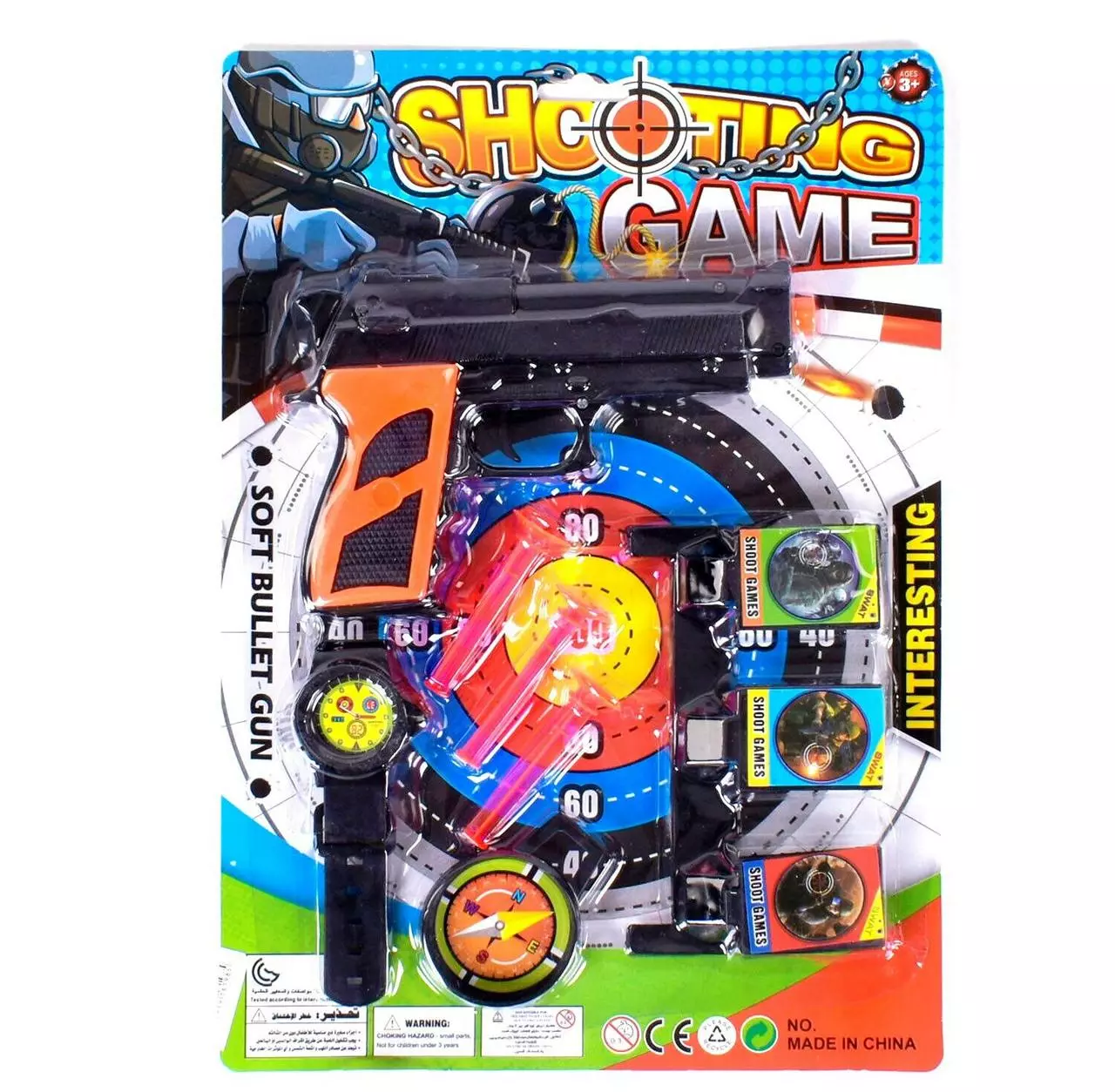 пистолет; - мишень; - 3 патрона на присоске; - компас; - часы.