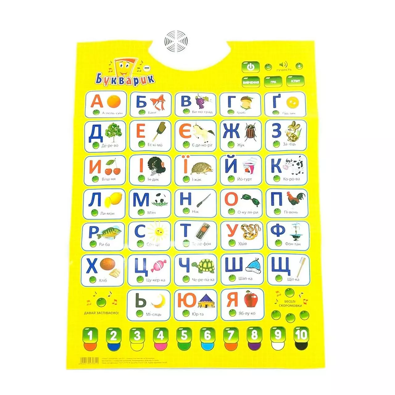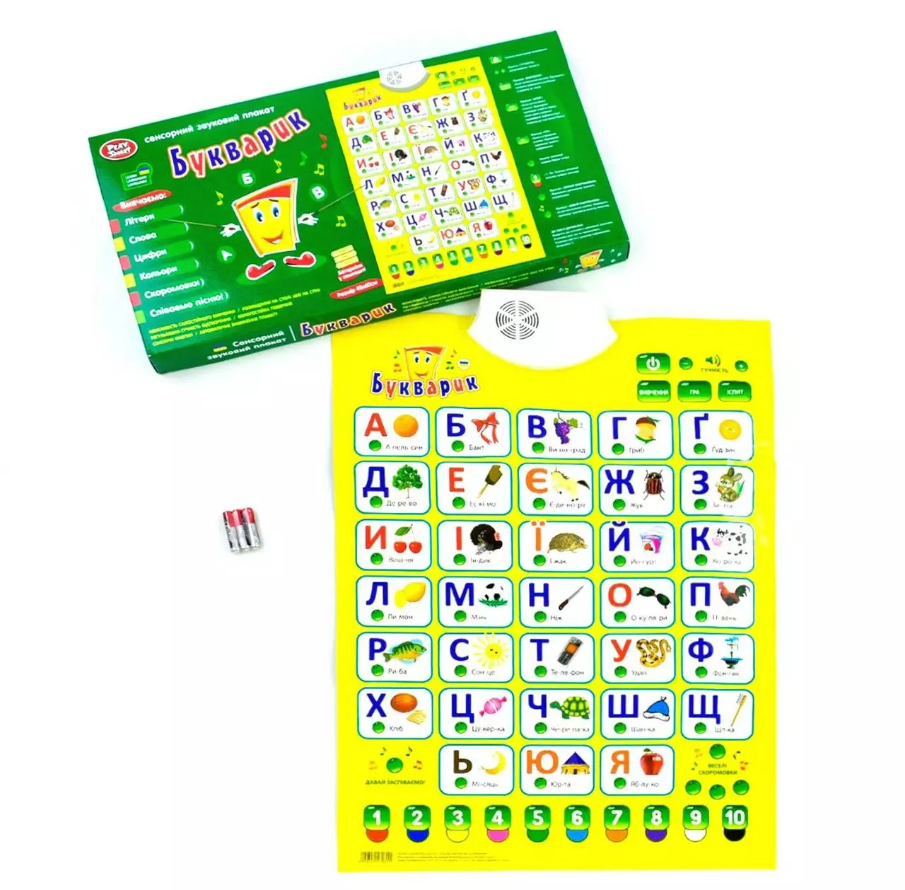 raquo; регулируется до нужного уровня. Это поможет отрегулировать громкость для каждого ребенка индивидуально, что дополнительно обезопасит его слух и эмоциональное состояние. Специальное крепление на задней стороне азбуки позволяет разместить игру на столе или повесить на стену в детской комнате. Выполнен плакат из полимерных материалов. Интерактивный плакат оснащен сенсорными кнопками, функцией автоматического отключения для экономии энергии, а также влагоустойчивой поверхностью, которая продлить срок его службы. Озвучивание игрушки на украинском языке. Работает от 3х батареек типа ААА (входят в комплект).