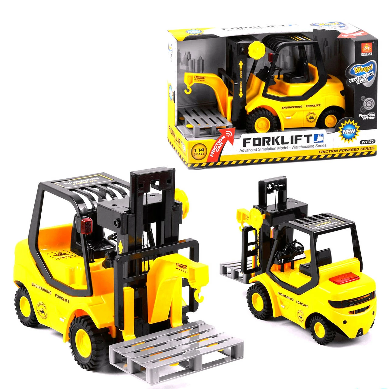 Ярко желтый погрузчик обладает подвижными деталями и современным
