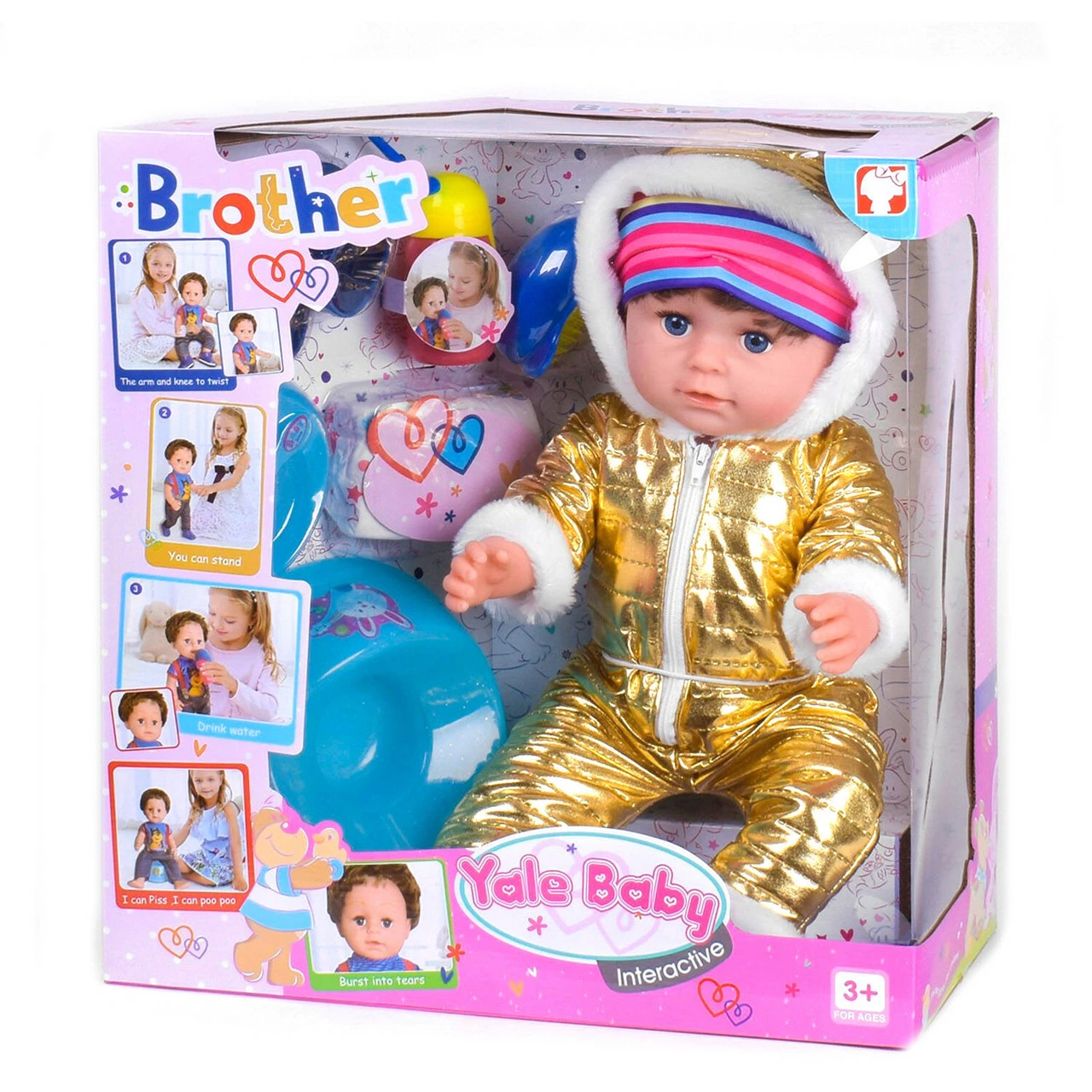 высококачественная дизайнерская одежда. Малыш одет в теплый зимний комбинезончик с пушистыми отворотами, а голову украшает полосатая шапочка. В качестве первостепенных аксессуаров по уходу за малышом в набор входит: бутылочка, горшок, памперс, расческа, ботиночки, тарелка с ложечкой. Комплектация: